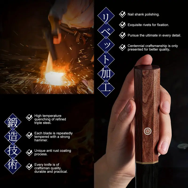 This 7-inch Japanese Santoku Knife by ENOKING is hand-forged from 5-layer 9CR18MOV high carbon steel, offering exceptional sharpness, durability, and precision for everyday cooking. Designed with an octagonal rosewood handle for a comfortable grip and balance, it comes in a premium gift box, making it an ideal choice for both professional chefs and home kitchens, as well as a thoughtful gift.