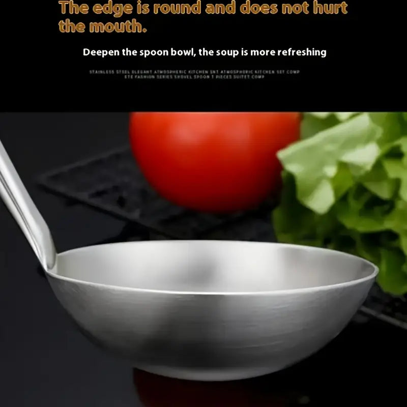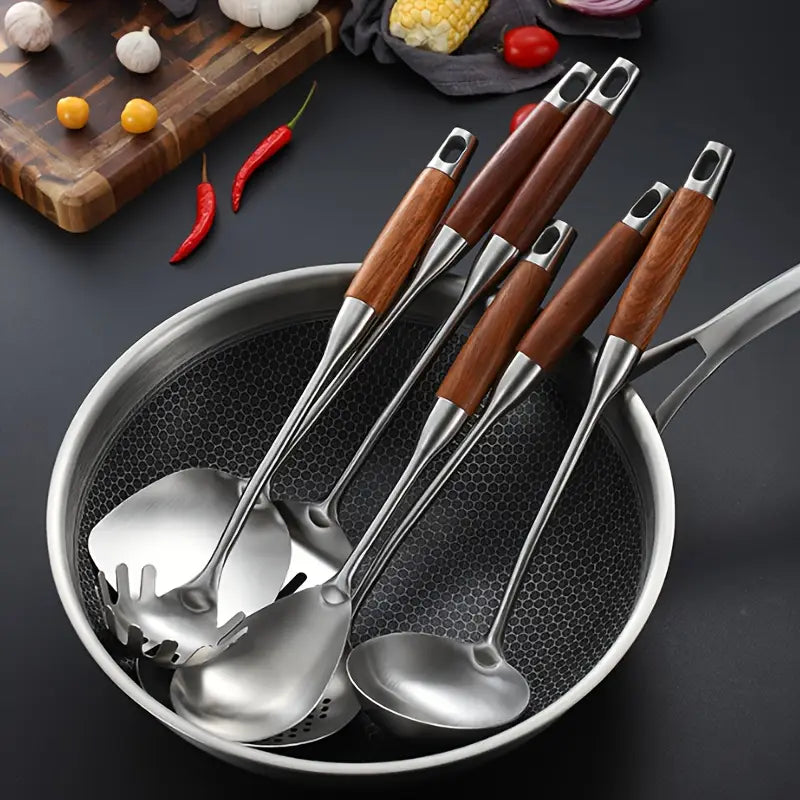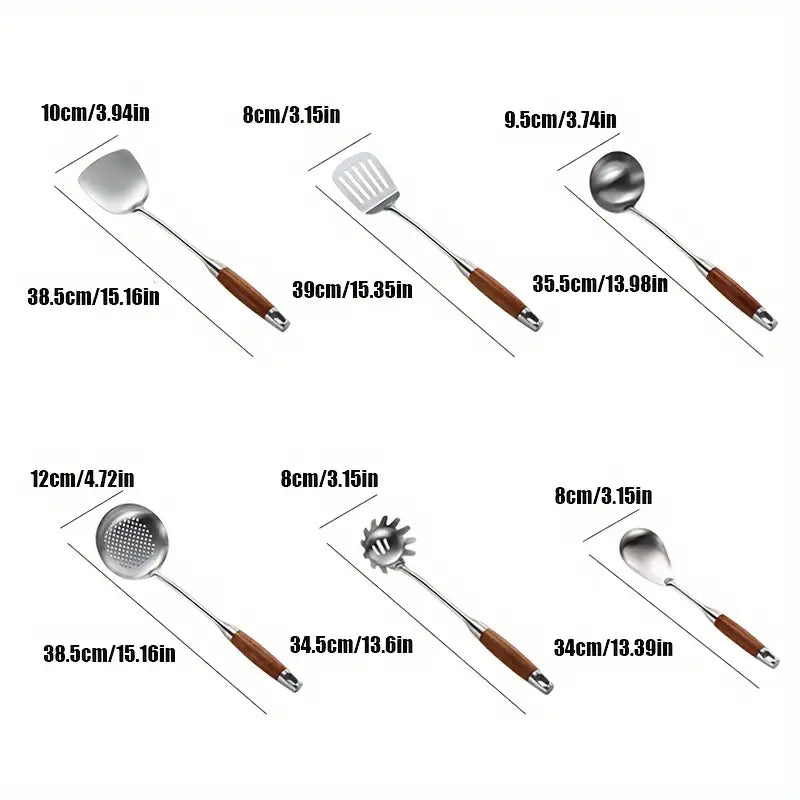 7-Piece Stainless Steel Kitchen Utensil Set with Wooden Handles - Soup Spoon, Turner, Skimmer, and More - Premium Cooking Tools for Home & Restaurant