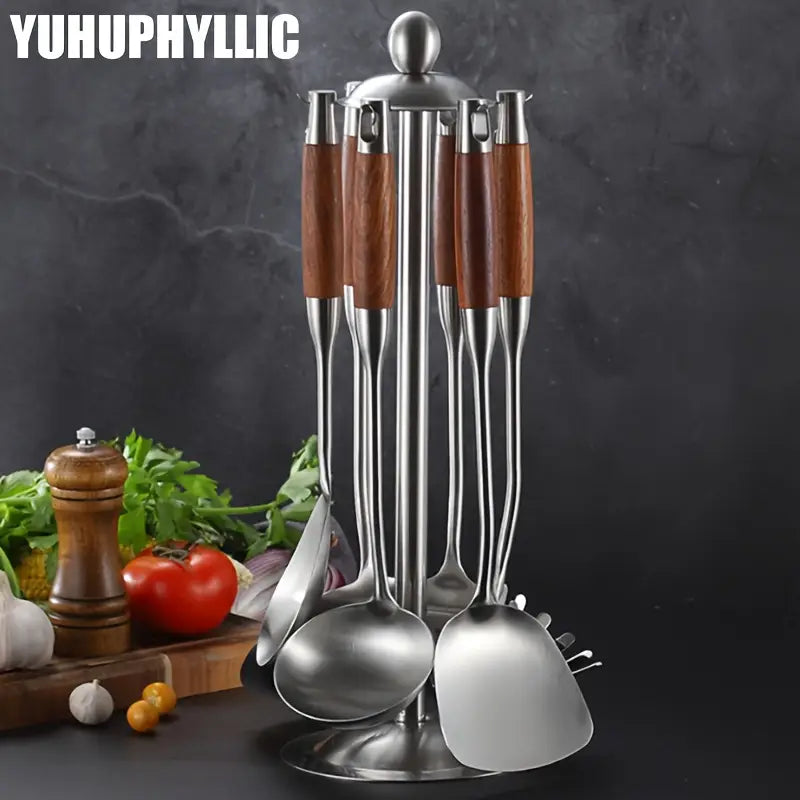 Elevate your kitchen experience with the YUHUPHYLLIC 7-Piece Stainless Steel Kitchen Utensil Set. Designed for both home chefs and professional kitchens, this set includes essential cooking tools that deliver durability and style. Crafted from high-quality stainless steel with ergonomic wooden handles, each piece is engineered for comfort and long-lasting performance.