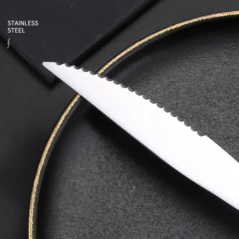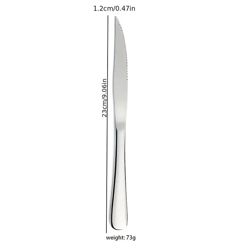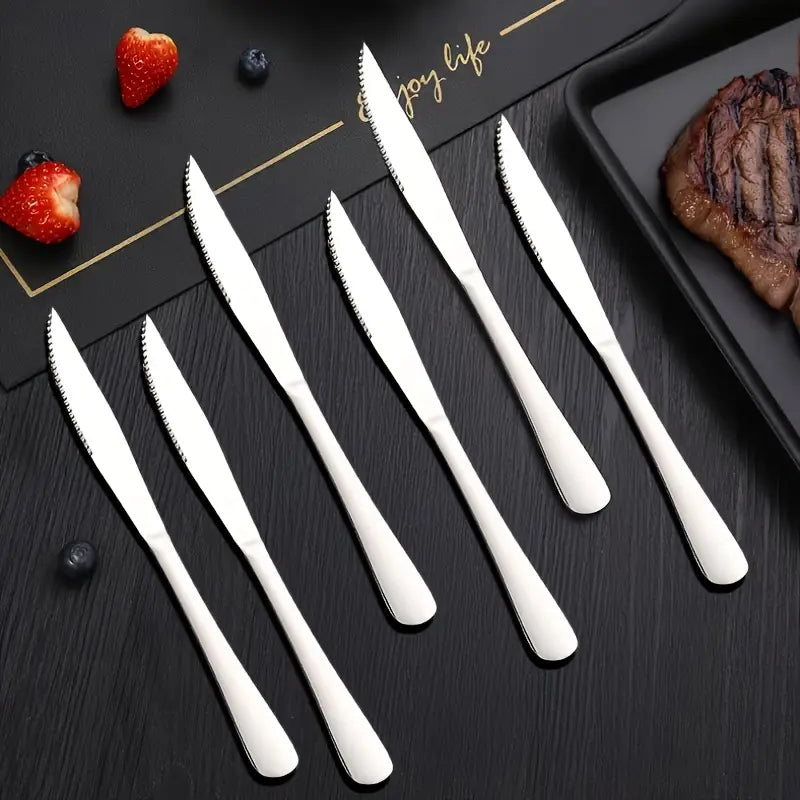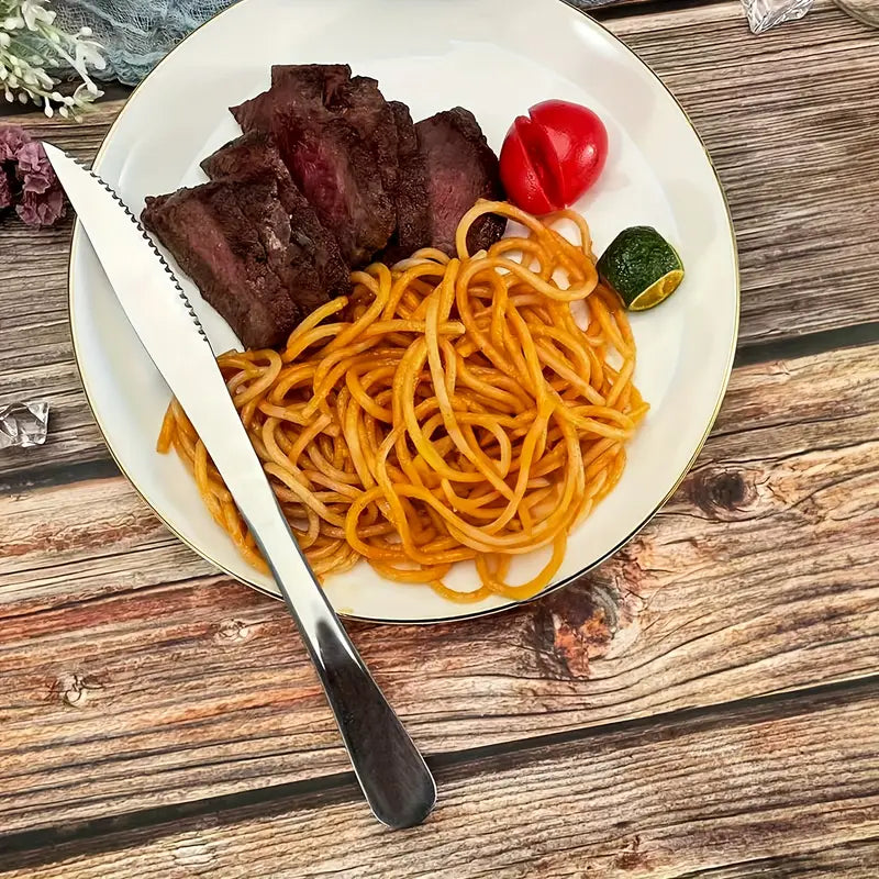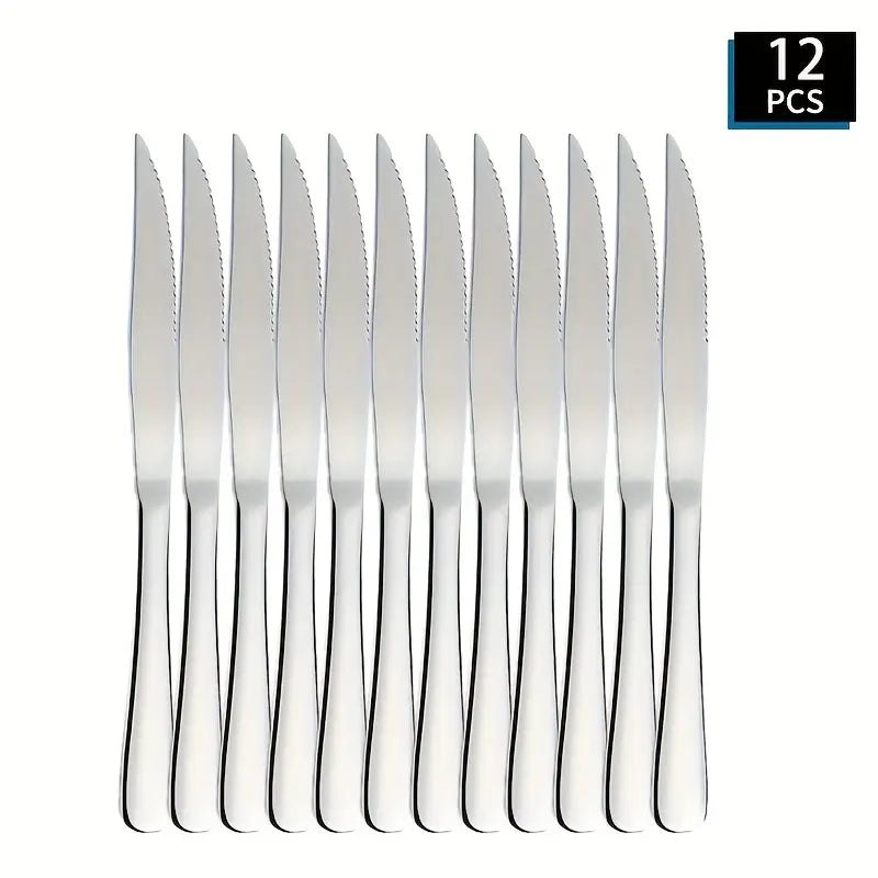 Elevate your dining experience with this 8/12pcs thickened stainless steel steak knife set, crafted for precision and durability. Featuring serrated, mirror-polished blades, these elegant and classic knives effortlessly cut through meat, beef, and other foods. Perfect for family meals, formal dining, or restaurant use, they are also dishwasher safe, combining functionality with timeless style for every table.