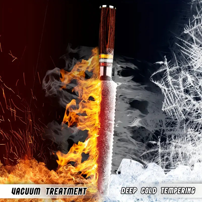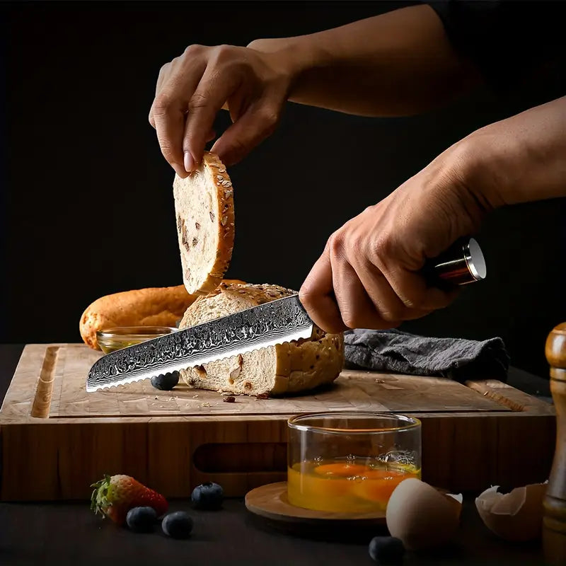 This 8-inch VG10 Damascus bread knife is crafted from 67-layer high carbon stainless steel, offering exceptional sharpness for cutting bread, meat, sushi, and fruit. The ergonomic Pakkawood handle ensures comfort and control, making it a versatile tool for any kitchen. Packed in an elegant gift box, it’s an ideal gift for culinary enthusiasts and professional chefs.