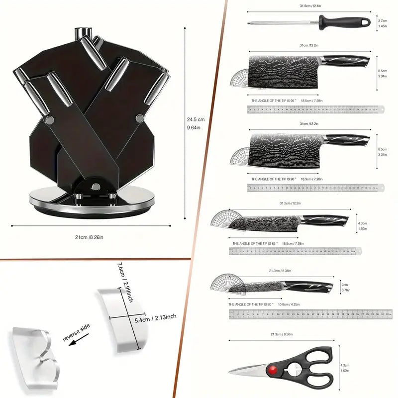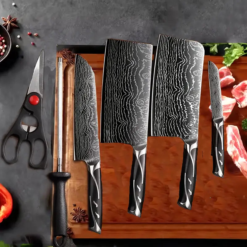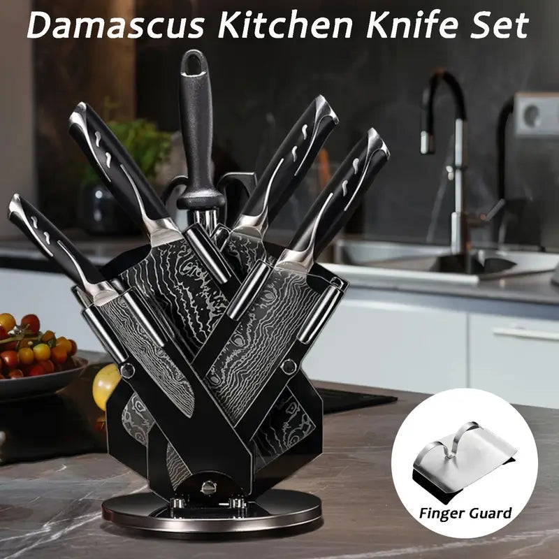Upgrade your kitchen with this 8-piece Damascus chef knife set, featuring high-quality knives, scissors, and sharpening rods. Designed with ergonomic ABS handles for comfort and safety, it includes finger guards to protect your hands while cutting. Perfect for everyday cooking, entertaining, or gifting for special occasions like Father’s Day, Mother’s Day, or Thanksgiving. Durable, stylish, and ideal for both home kitchens and bars.
