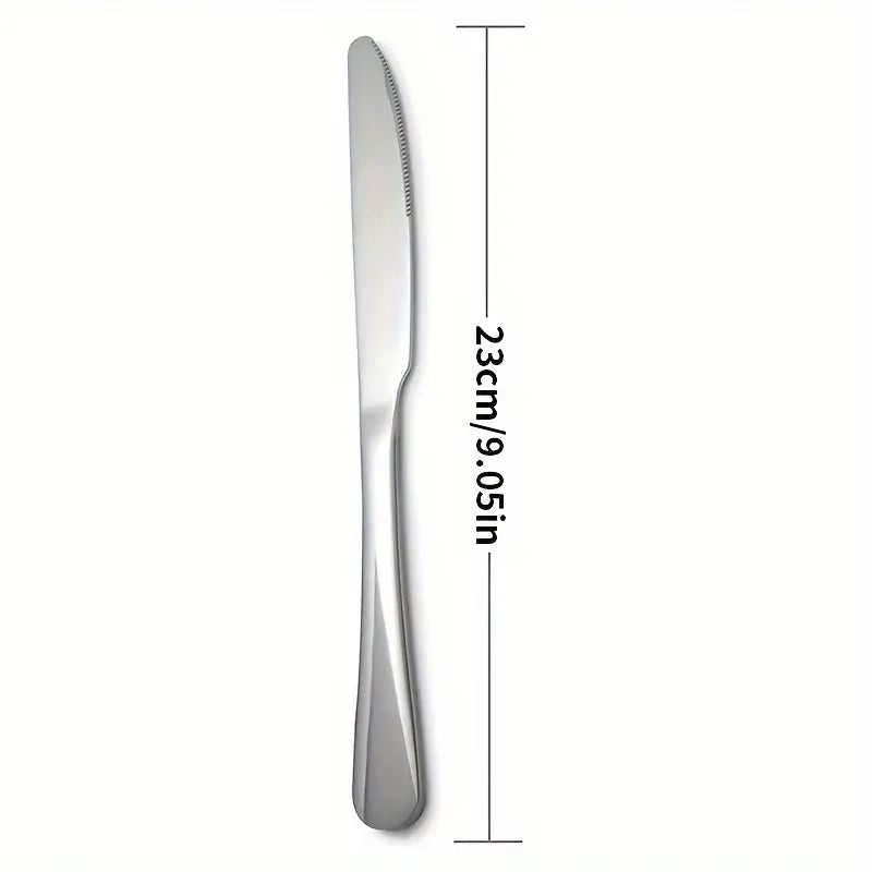 Enhance your dining table with this 8-piece silvery stainless steel dinner knife set. Each knife features a mirror-polished finish and solid heavy steel construction for durability and elegance. Perfect as a butter knife, spreader, or dinner knife, these knives are ideal for daily use at home, family dinners, or in hotels. Dishwasher safe and designed for long-lasting performance, making them an essential addition to your kitchen cutlery collection.
