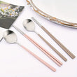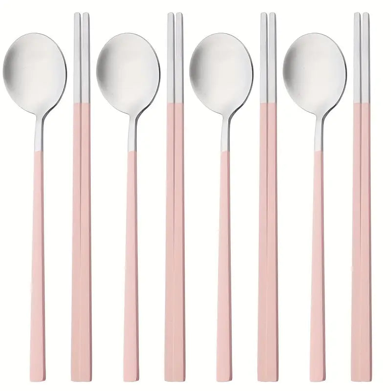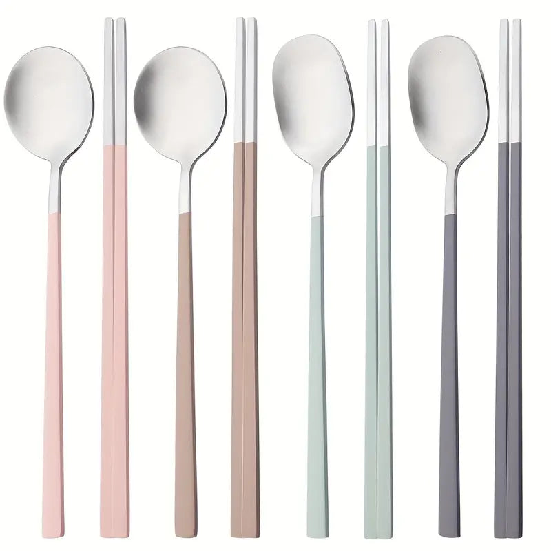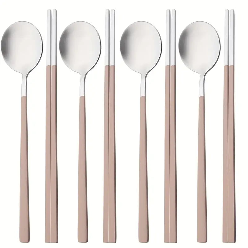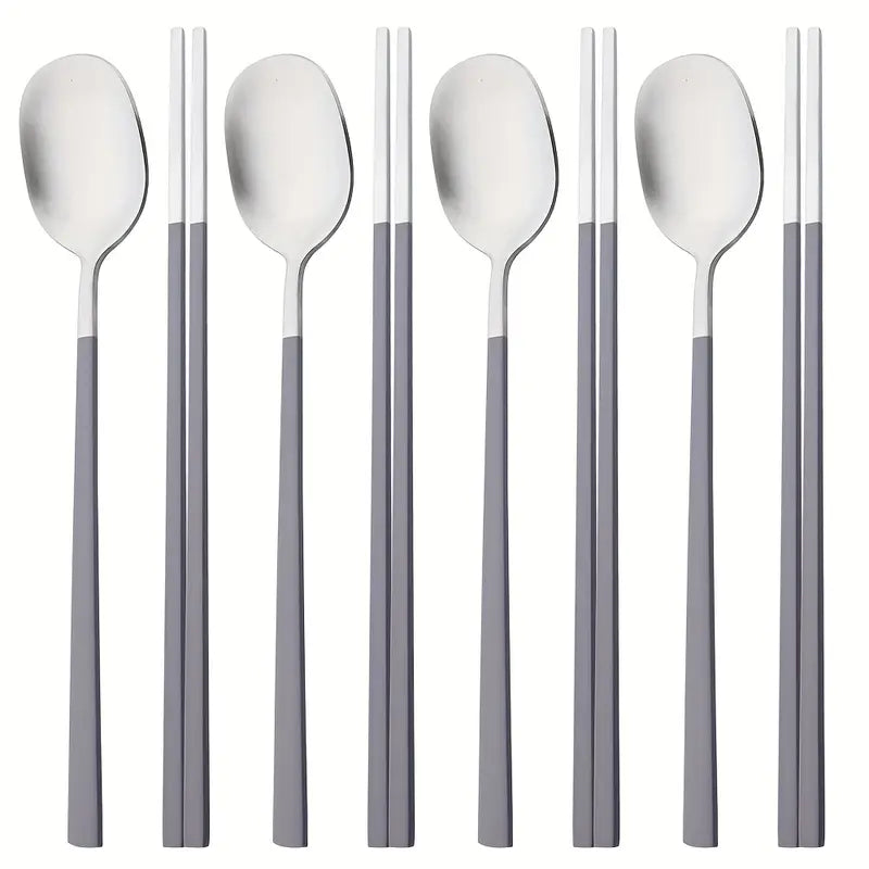 Elevate your dining experience with this 8-piece stainless steel cutlery set. Featuring matte sushi flat chopsticks and a main spoon set, this collection is designed for style and durability. Whether you're enjoying a casual meal at home, hosting a party, or dining at a restaurant, these sleek and modern utensils are perfect for every occasion. The set is also ideal for outdoor travel, providing the convenience of high-quality cutlery wherever you go. Crafted from premium stainless steel, these utensils are built to last while adding a touch of elegance to your table. Perfect for anyone who loves quality, practicality, and design.