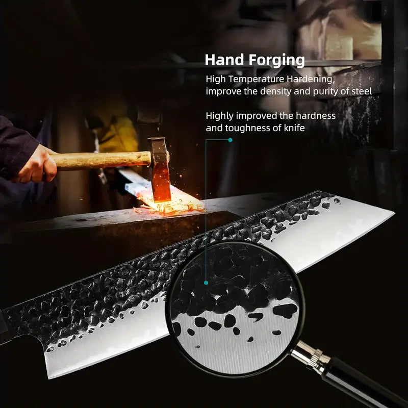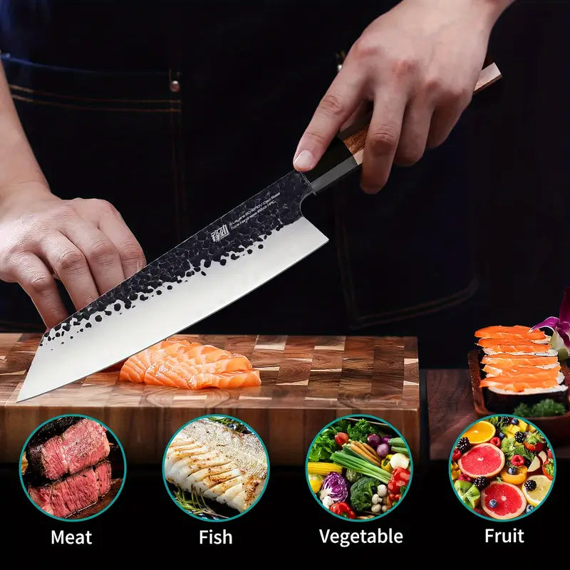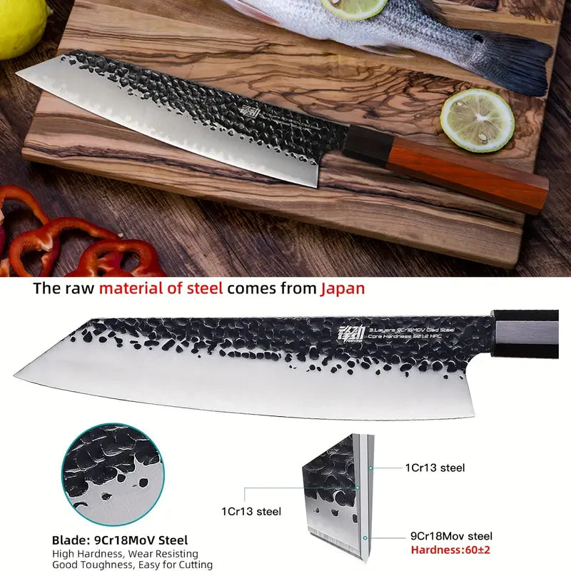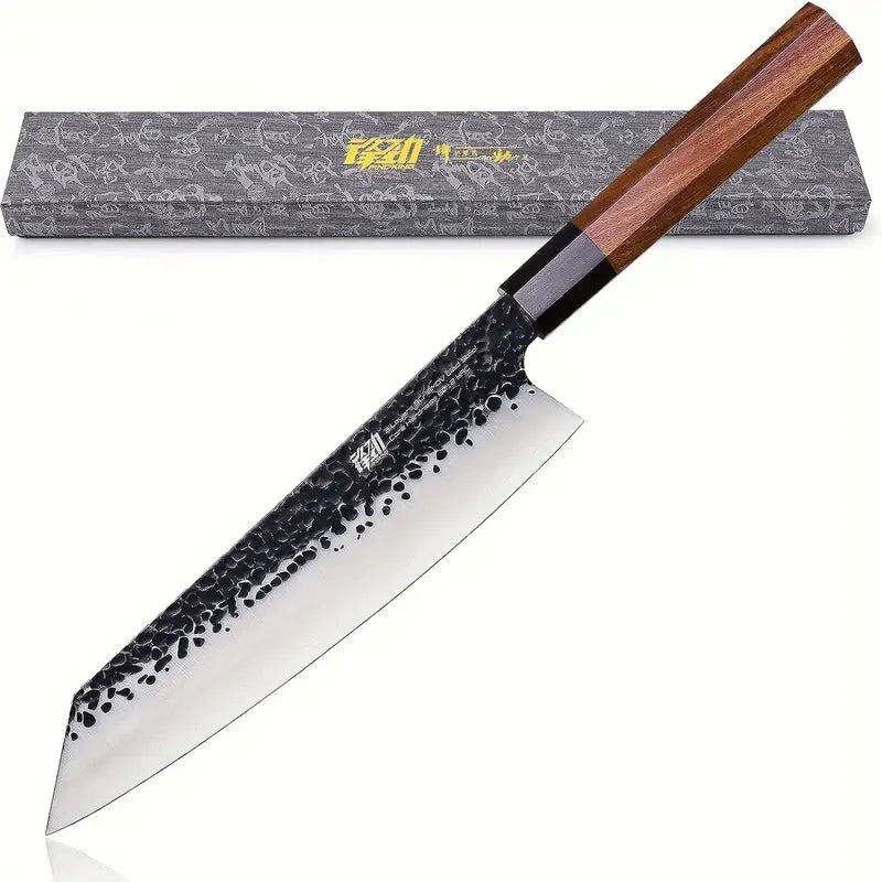 This 9-inch Kiritsuke Chef Knife is a premium hand-forged kitchen tool, crafted from durable 9Cr18Mov triple-layer steel. Its sharp, precise edge is perfect for cutting meat, vegetables, and seafood, making it ideal for both professional chefs and home cooks. The ergonomic wooden handle ensures comfort and control during use, while the elegant gift box makes it a perfect present for culinary enthusiasts. Upgrade your kitchen with this high-quality, versatile knife.