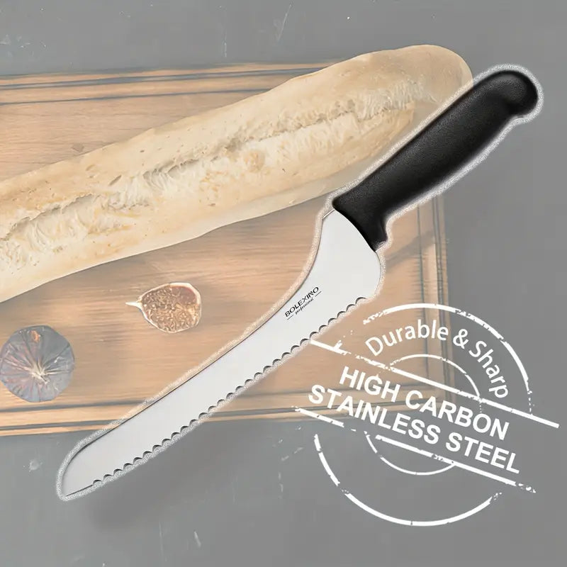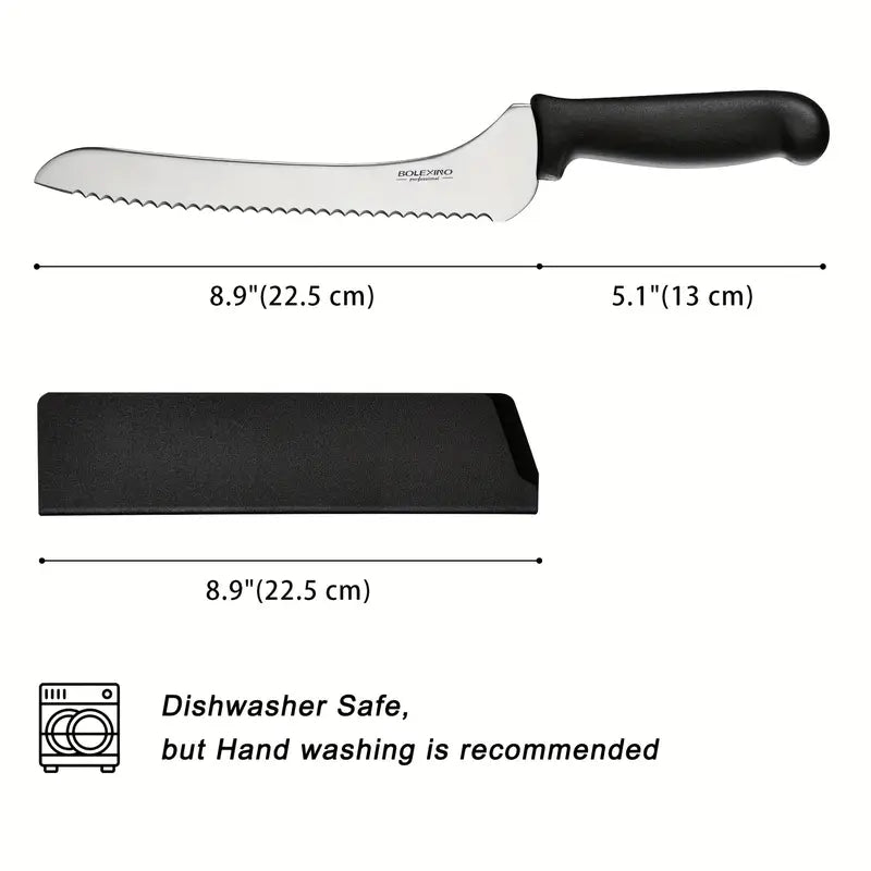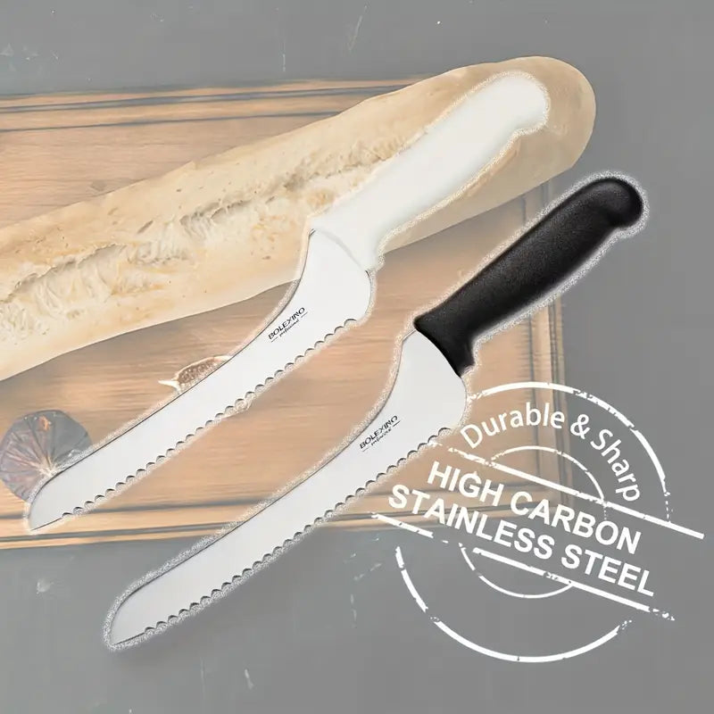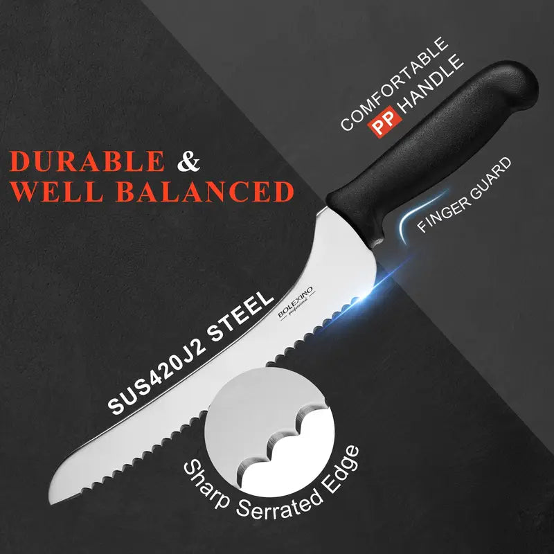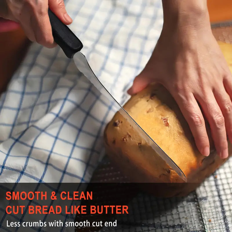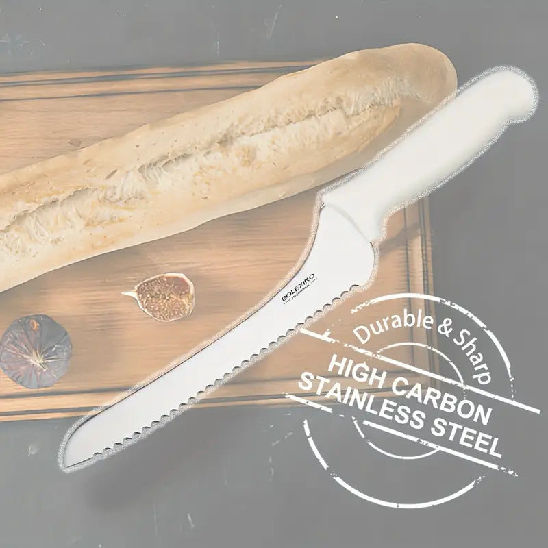 This 9-inch offset serrated bread knife features a wavy edge made from high carbon stainless steel, designed for effortless slicing of homemade bread, crusty loaves, cakes, and bagels. Available in black and white, it’s a versatile and durable kitchen tool, perfect for both professional chefs and home bakers.