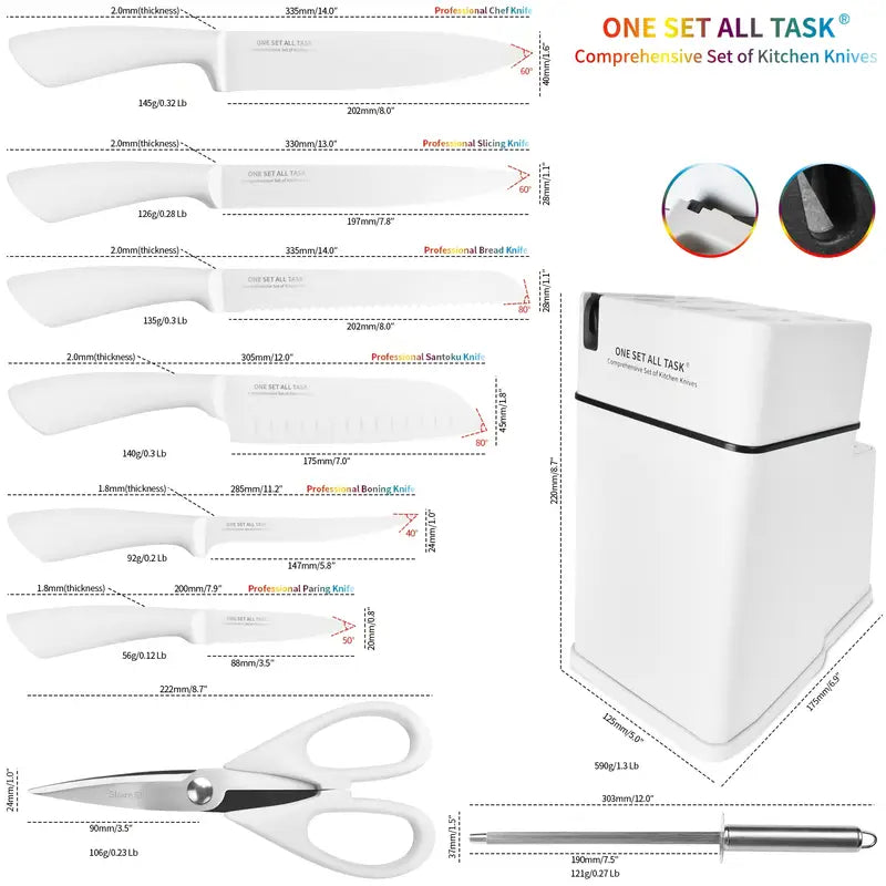 Upgrade your kitchen with this 9-piece knife set crafted from high carbon stainless steel for precision and durability. Includes chef, bread, santoku, fruit, boning, and serrated knives, all housed in a sleek white block with a built-in sharpener for effortless maintenance. Perfect for everyday cooking and professional-level prep.