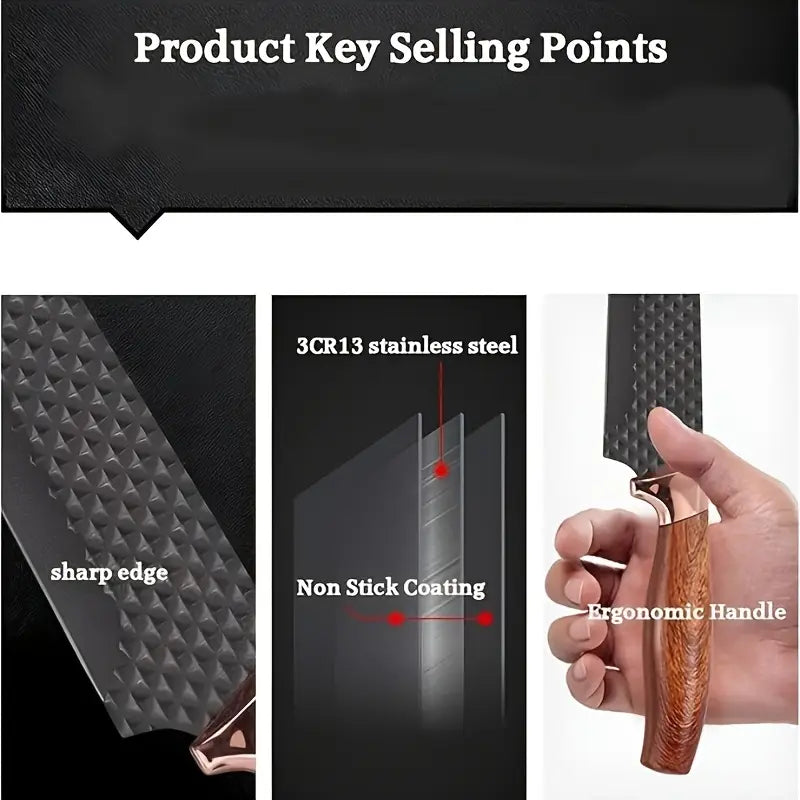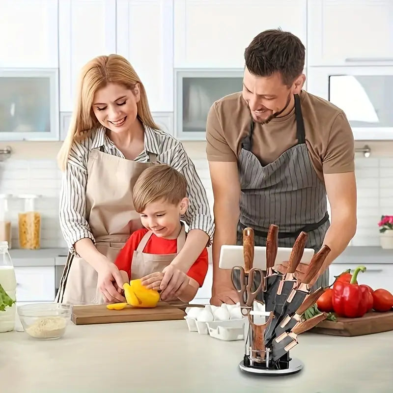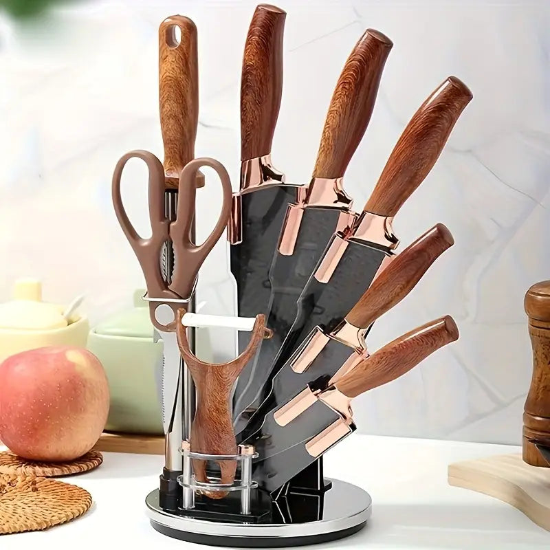 Upgrade your kitchen with this 9-piece knife set, crafted from high-carbon stainless steel for lasting sharpness and durability. Perfect for home chefs and professionals alike, the set includes a knife sharpener and a rotating block for safe, convenient storage. Anti-rust and non-stick, these knives make every cutting, slicing, and chopping task effortless.