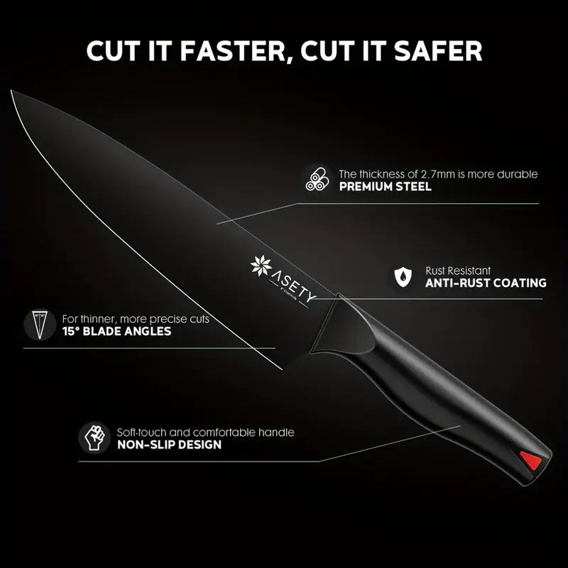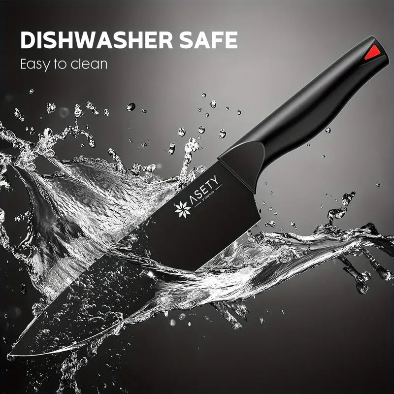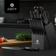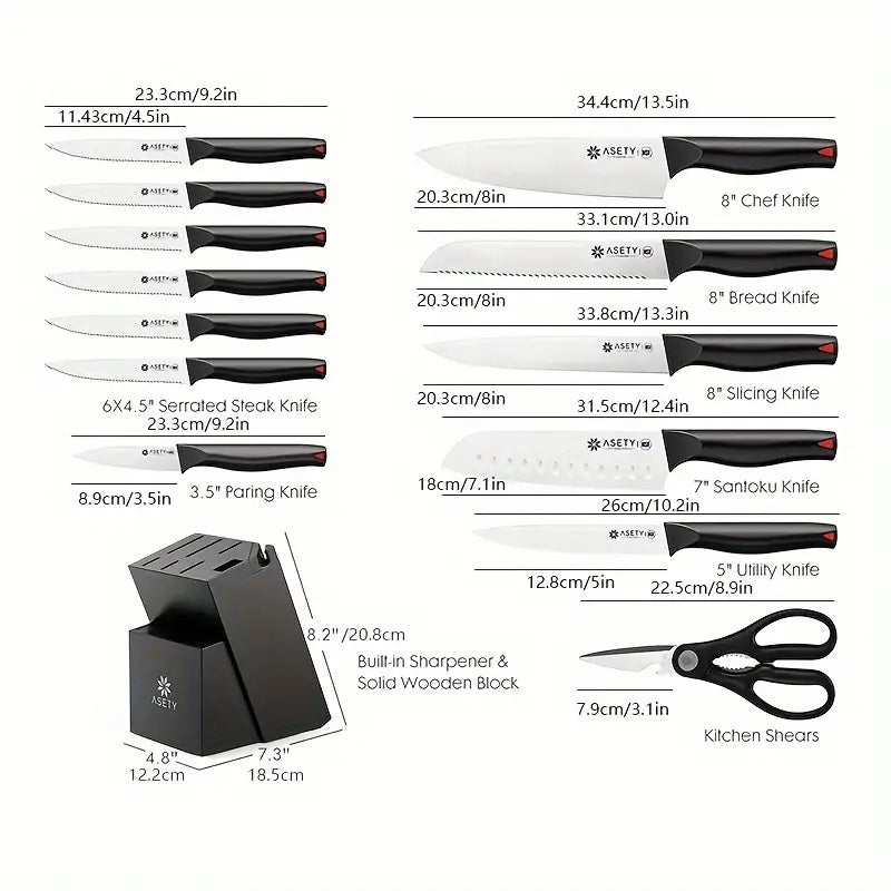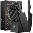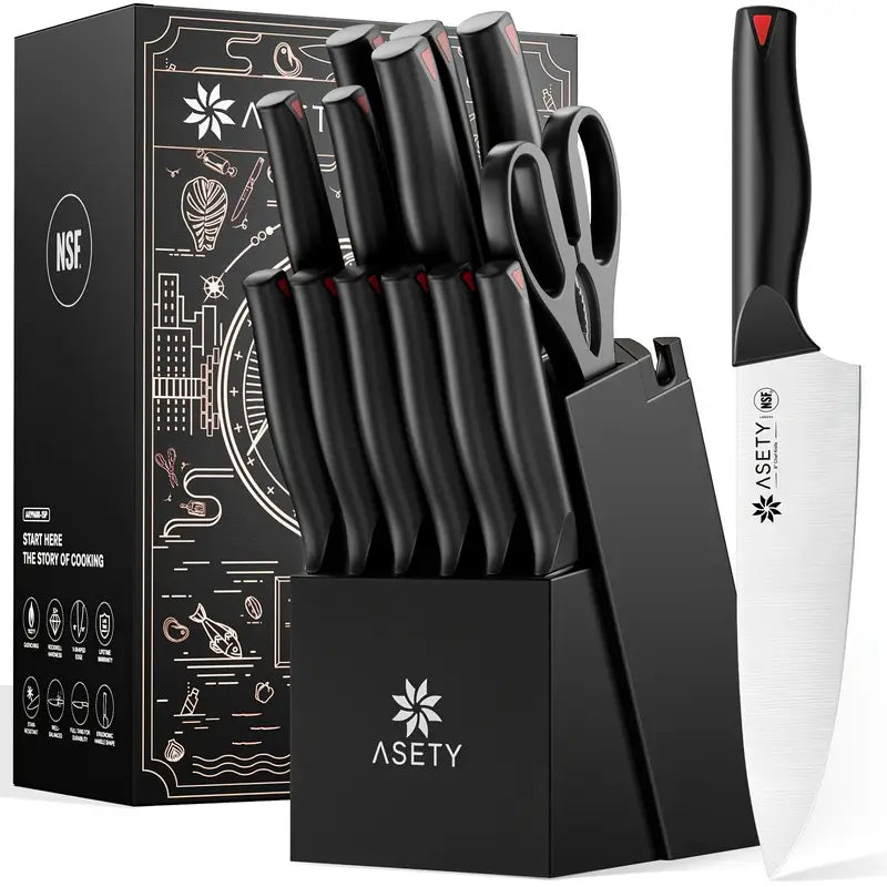 Asety 15-Piece High Carbon Stainless Steel Kitchen Knife Set with Built-In Sharpener Block - NSF Food Safe, Dishwasher Safe, Black