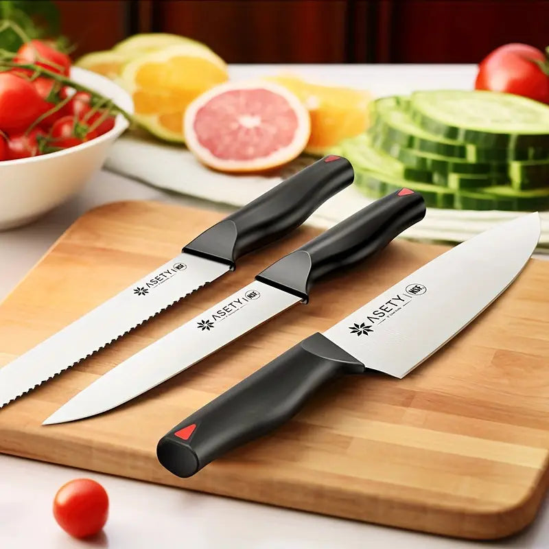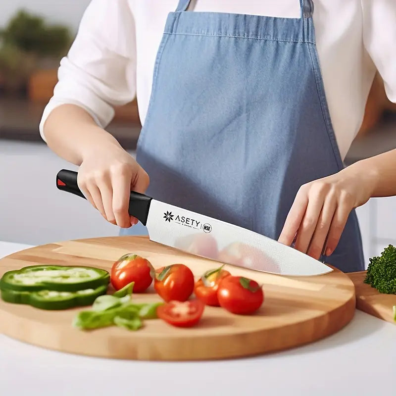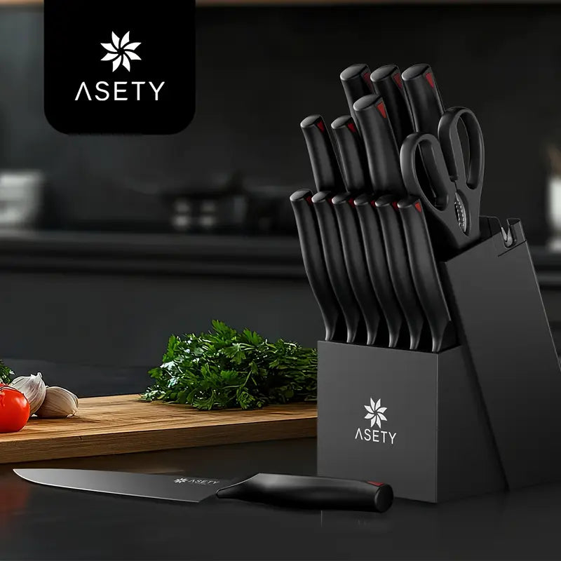 The Asety 15-piece kitchen knife set features high carbon stainless steel blades for precision and durability, complete with a built-in sharpener block for easy maintenance. Designed for everyday kitchen tasks, this NSF food-safe, dishwasher-safe set includes all the essential knives and comes in an elegant black box, perfect for modern kitchens.