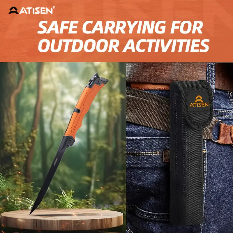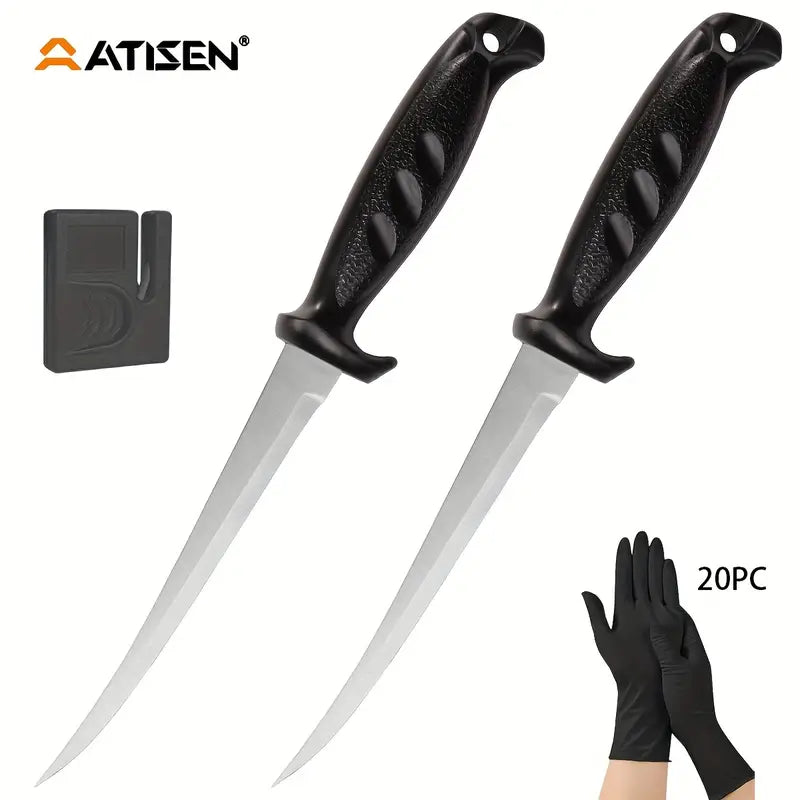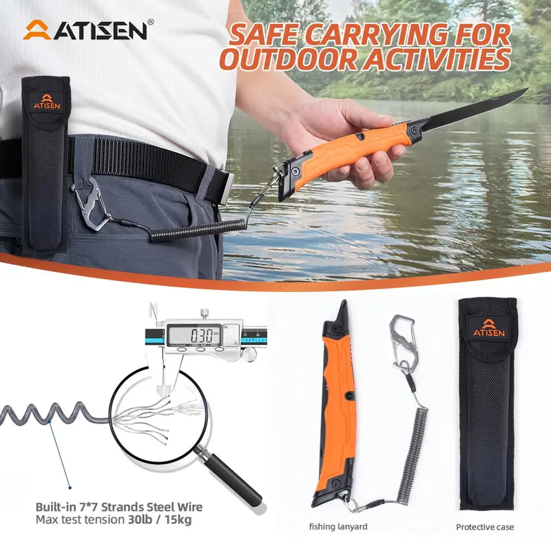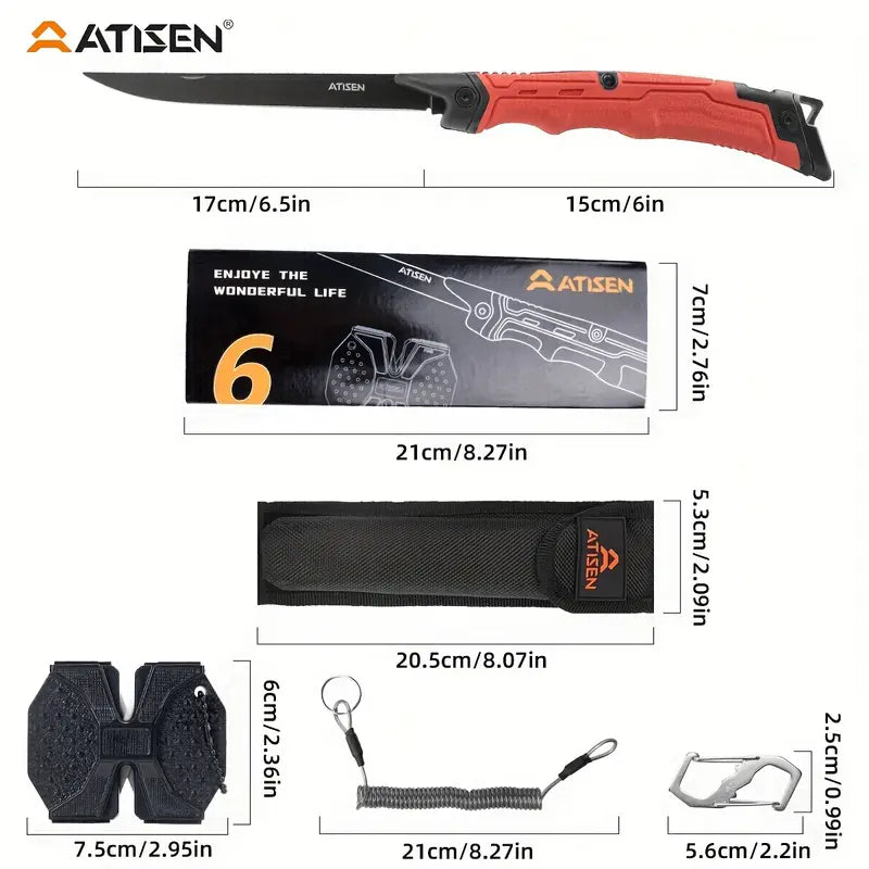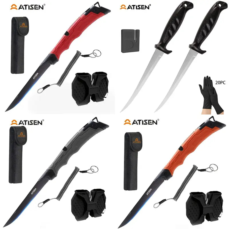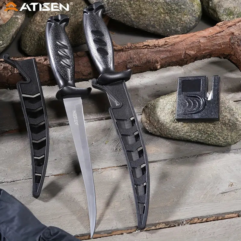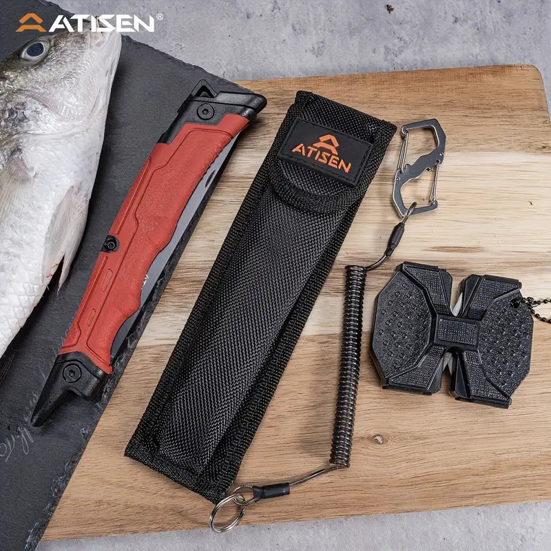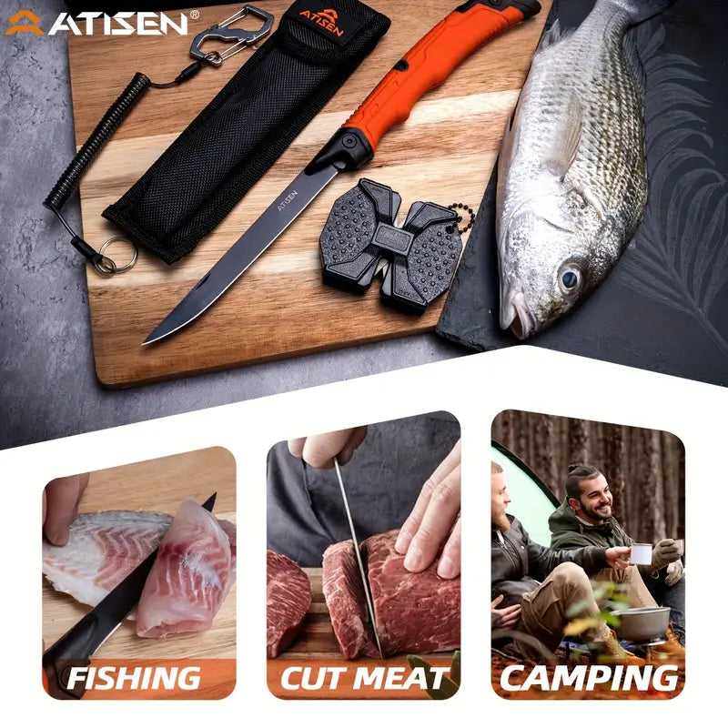 The ATISEN Razor-Sharp Fillet Knife is designed for precision cutting of meat, poultry, and fish. Featuring a durable, non-slip handle for a secure grip, this knife ensures a smooth and safe cutting experience. It comes complete with a protective sheath and a knife sharpener, making it a perfect addition to your outdoor fishing gear and kitchen tools.