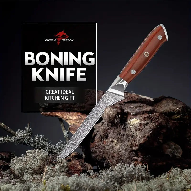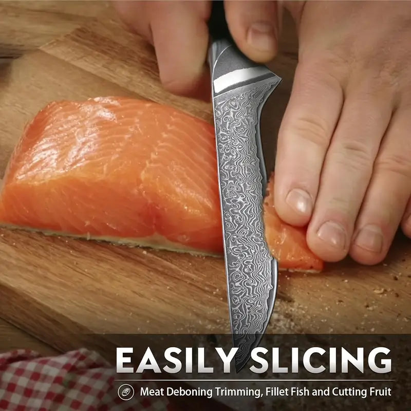 This 5.6-inch Damascus fillet knife is designed for precision meat cutting, fish fileting, and chicken deboning. Featuring a razor-sharp edge, it ensures effortless trimming and precise cuts every time. The high-quality construction makes it an essential tool for home chefs and professionals alike. Perfect for those who demand sharpness and durability, this knife comes in an elegant gift box, making it a great gift for cooking enthusiasts.