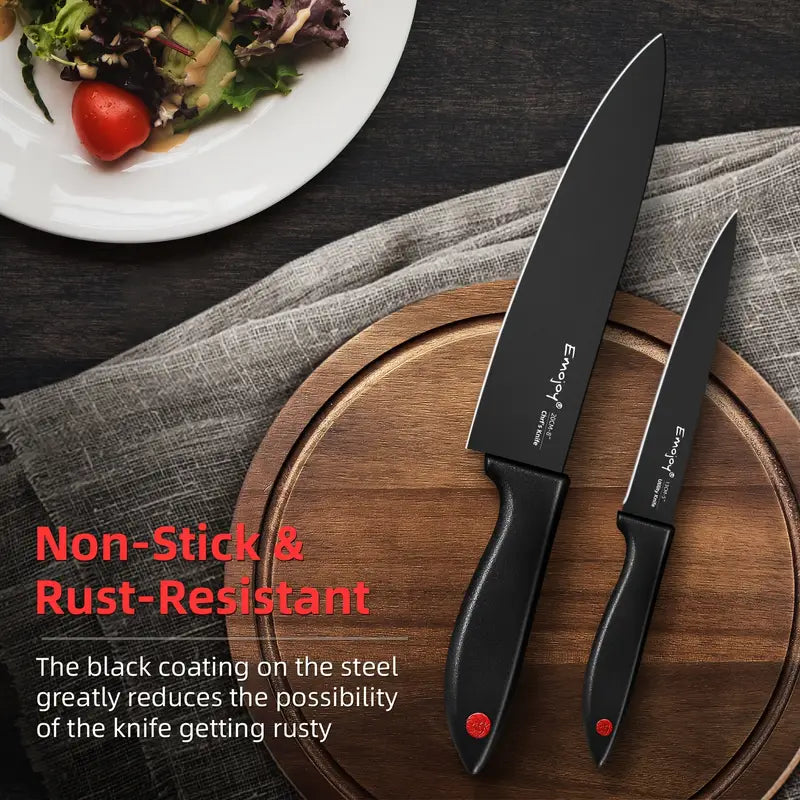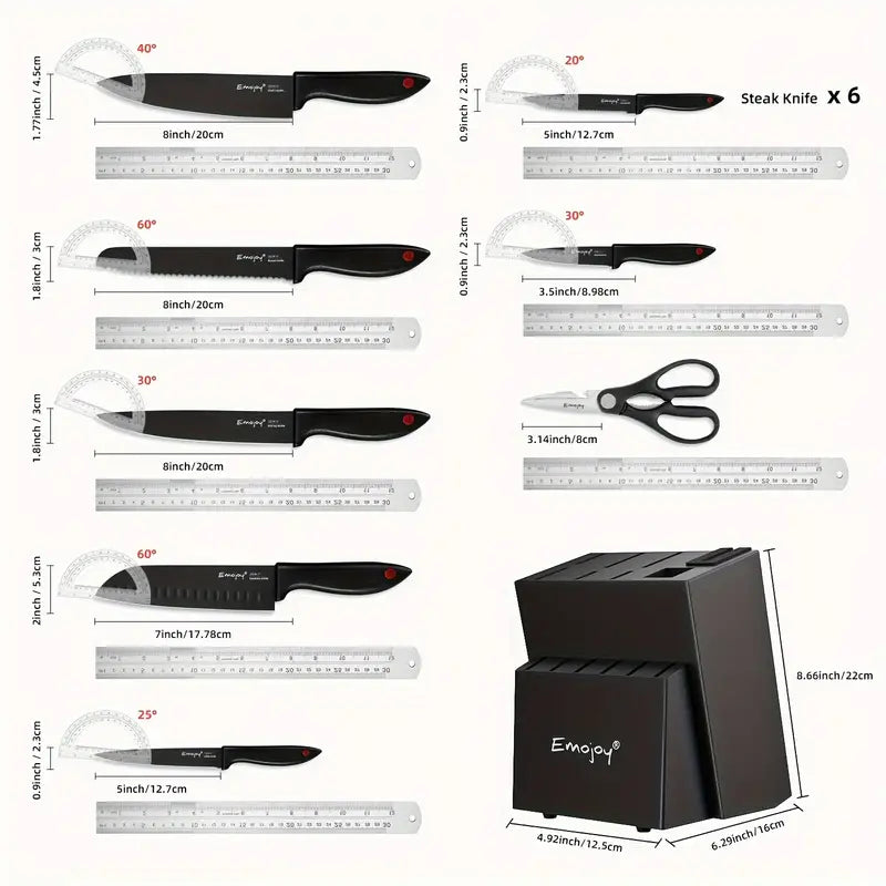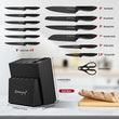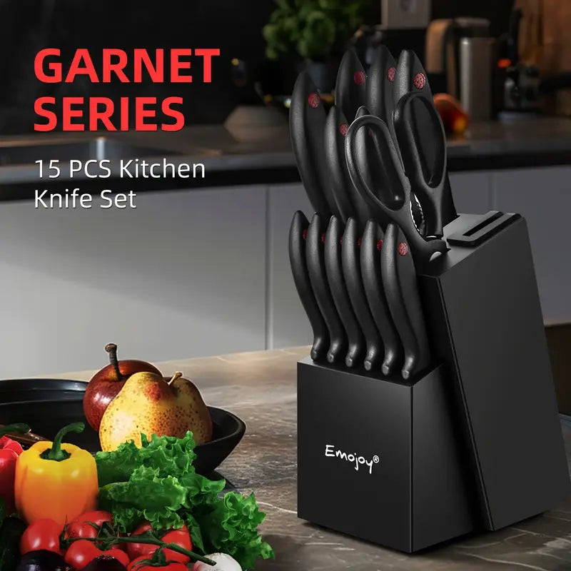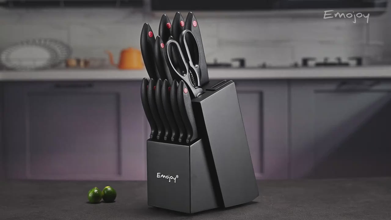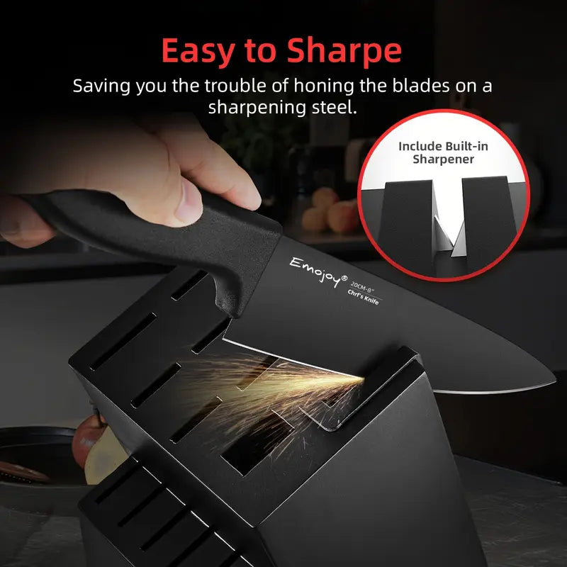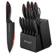 Emojoy 15-Piece Stainless Steel Kitchen Knife Set with Block and Built-in Sharpener, Dishwasher Safe, Black