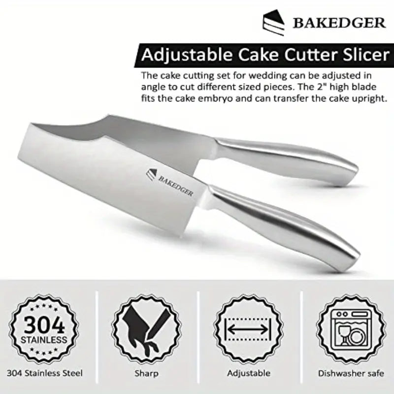This premium stainless steel cake knife and slicer features an ergonomic handle for comfortable use and a sharp, durable blade that ensures precise slicing for cakes, pies, pastries, and more. Its sleek metallic finish makes it an elegant addition to any event, whether it's a wedding, birthday, or celebration. Perfect for cake decorating and serving, this high-quality dessert divider is designed for ease of use and long-lasting performance.