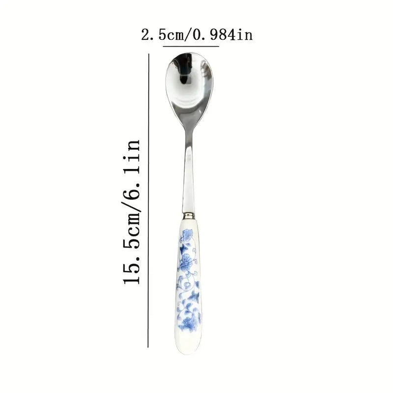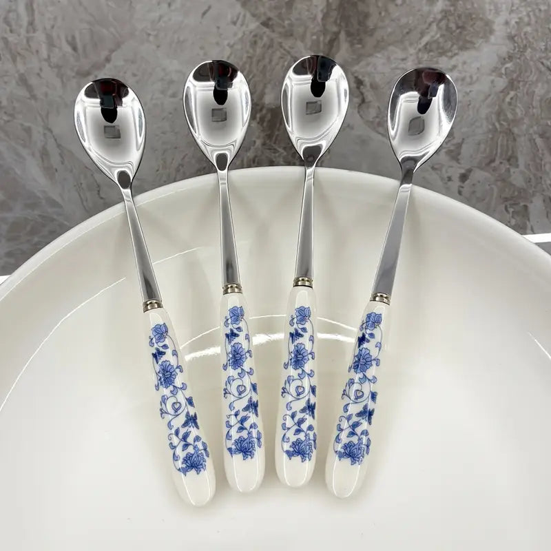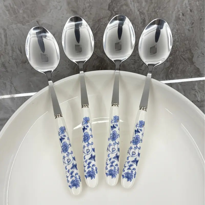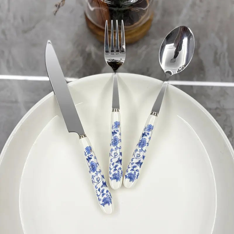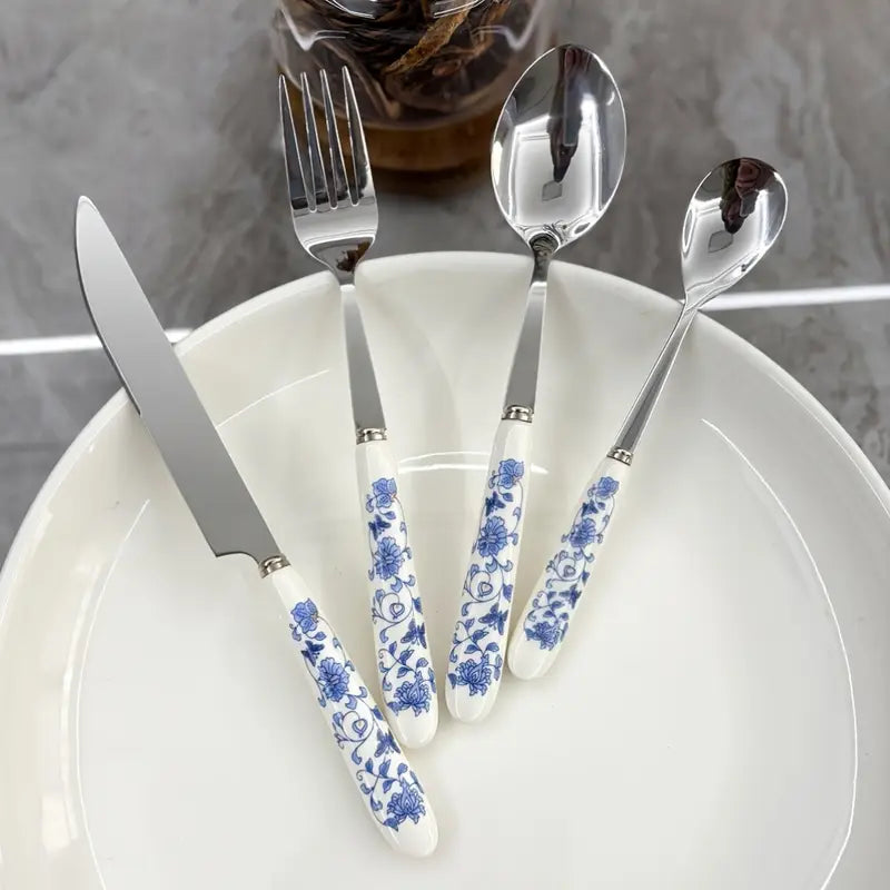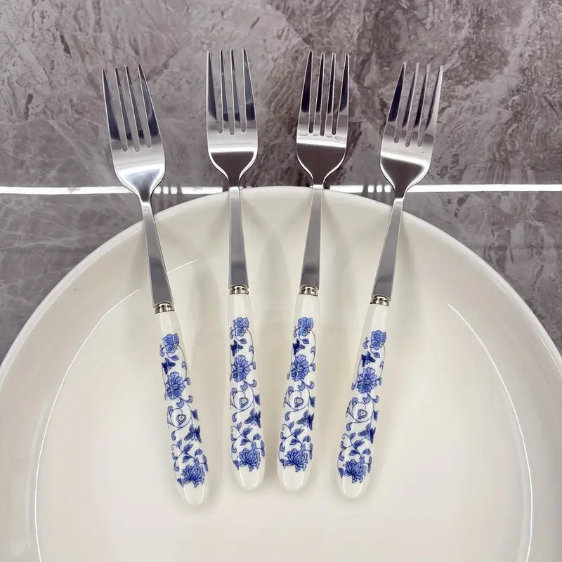 Enhance your dining experience with this elegant 4-piece cutlery set, featuring floral blue and white printed ceramic handles and polished stainless steel utensils. Perfect for both casual meals and special occasions, this set includes: