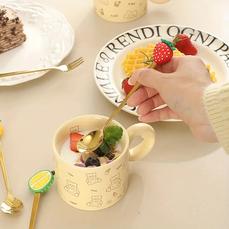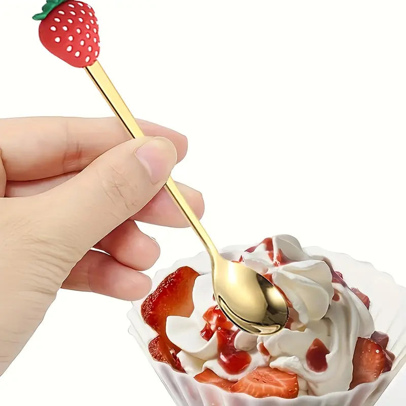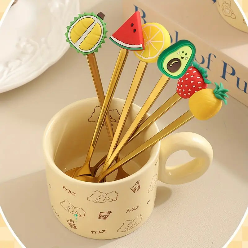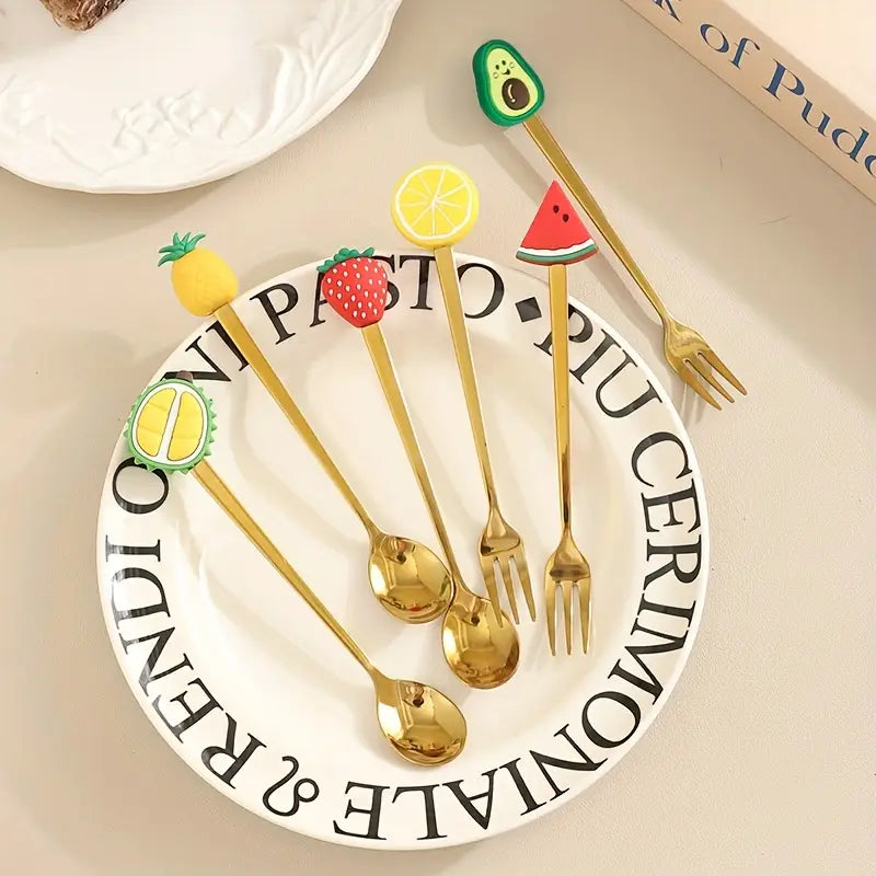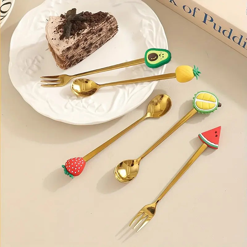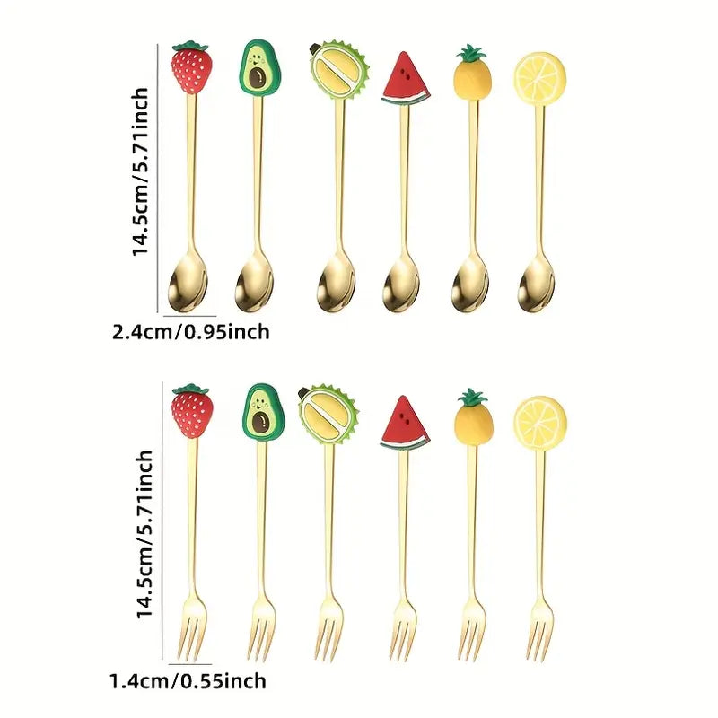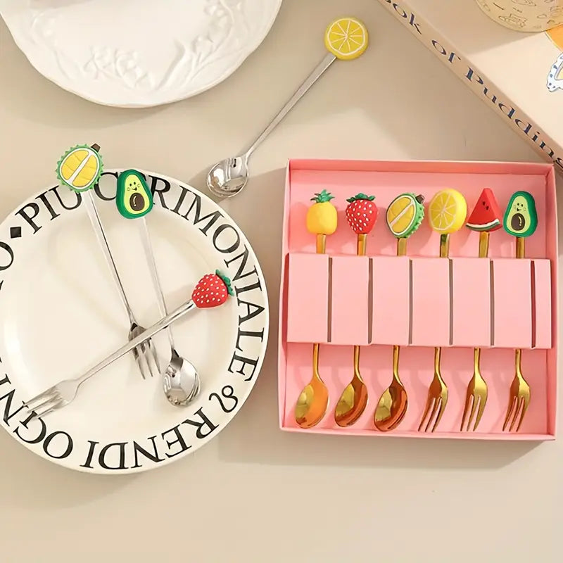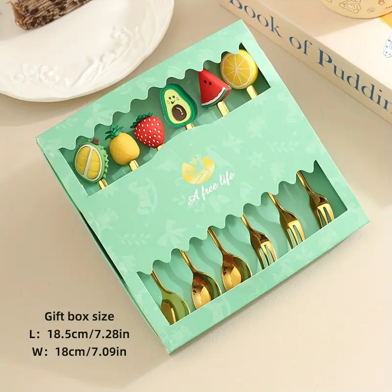 Fruit Theme Stainless Steel Dessert Spoon and Fork Set - 6pcs with Cute Fruit Handles, Perfect for Coffee, Ice Cream & Beverages - Gift Box Included