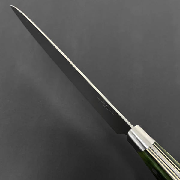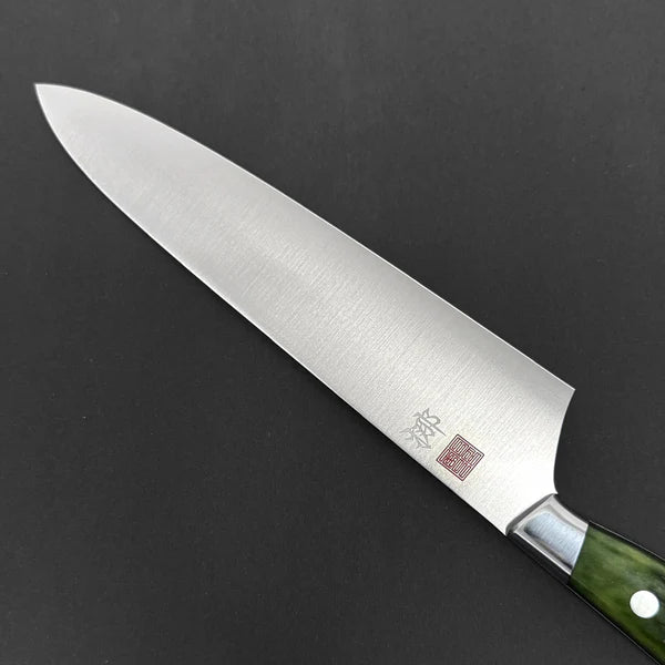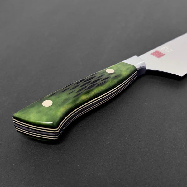 Crafted for precision and comfort, the Gyuto 210mm (8.2") chef knife features a striking green jigged bone handle that provides a secure, ergonomic grip. Its sharp, durable blade is perfect for various kitchen tasks, while the included saya cover offers protection for both the blade and your hands. Ideal for both professional chefs and home cooks, this knife combines style and functionality for effortless cooking experiences.