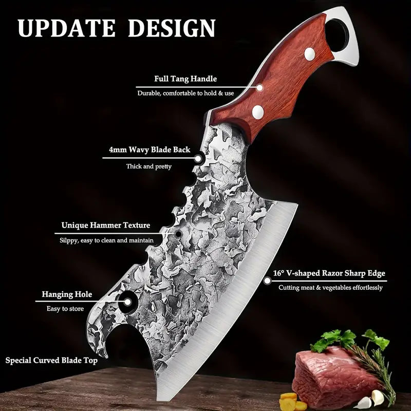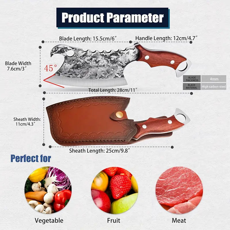 This hand-forged meat cleaver features a razor-sharp blade for effortless meat and vegetable cutting. Complete with a protective sheath, it’s ideal for home kitchens, outdoor camping, or BBQs, and makes a perfect gift for Father’s Day, Christmas, Thanksgiving, or any special occasion.
