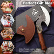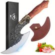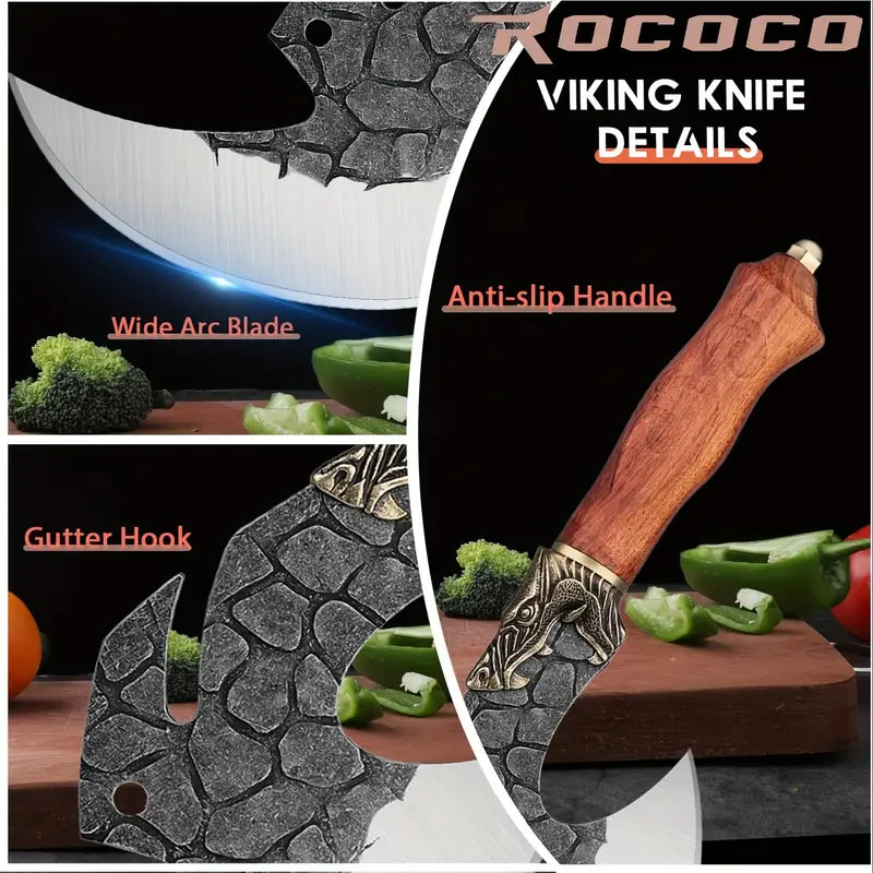 This Viking-inspired Ulu knife features a hand-forged carbon steel blade and a sturdy walnut handle for precise meat, vegetable, and BBQ chopping. Its ergonomic rocking design makes cutting effortless, while the included faux leather sheath ensures safe storage. Perfect for chefs, hunters, and outdoor enthusiasts, it also makes a unique gift for any cooking or camping lover.