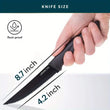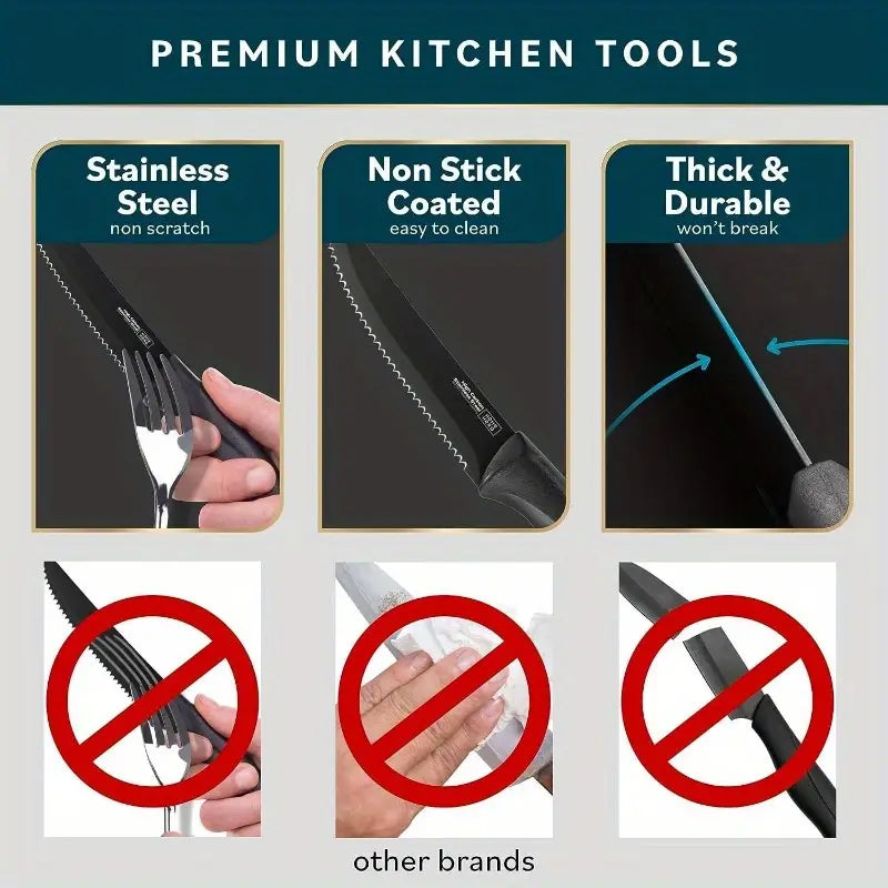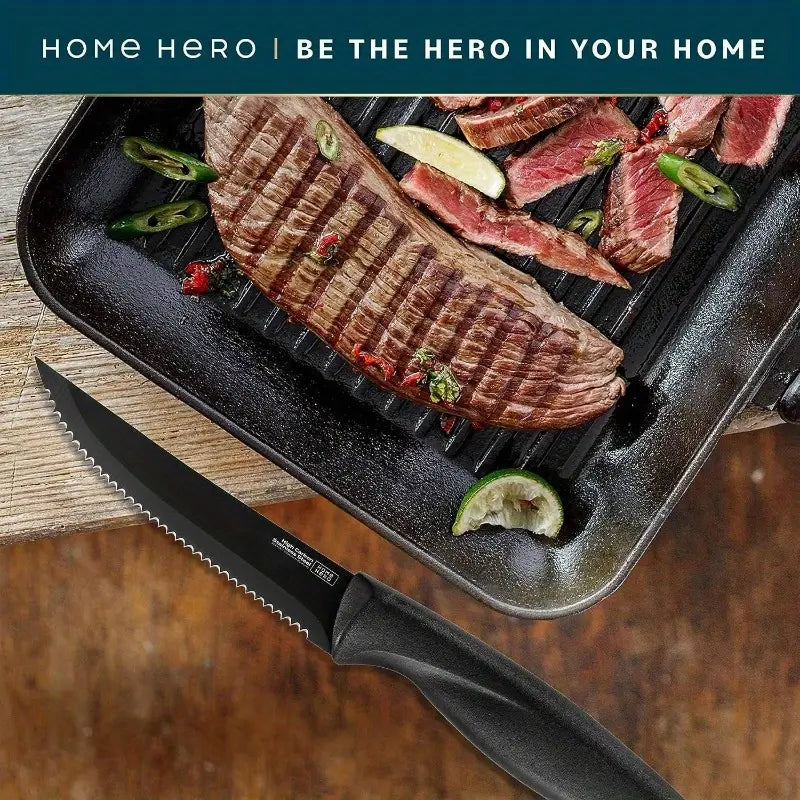 This 6-piece Home Hero kitchen knife set includes essential tools for every home cook: a chef's knife, utility knife, paring knife, bread knife, steak knives, and kitchen scissors. Crafted from durable stainless steel, each knife features a sleek black finish, making this set a stylish and functional addition to your kitchen, perfect for cooking, baking, and everyday food preparation.