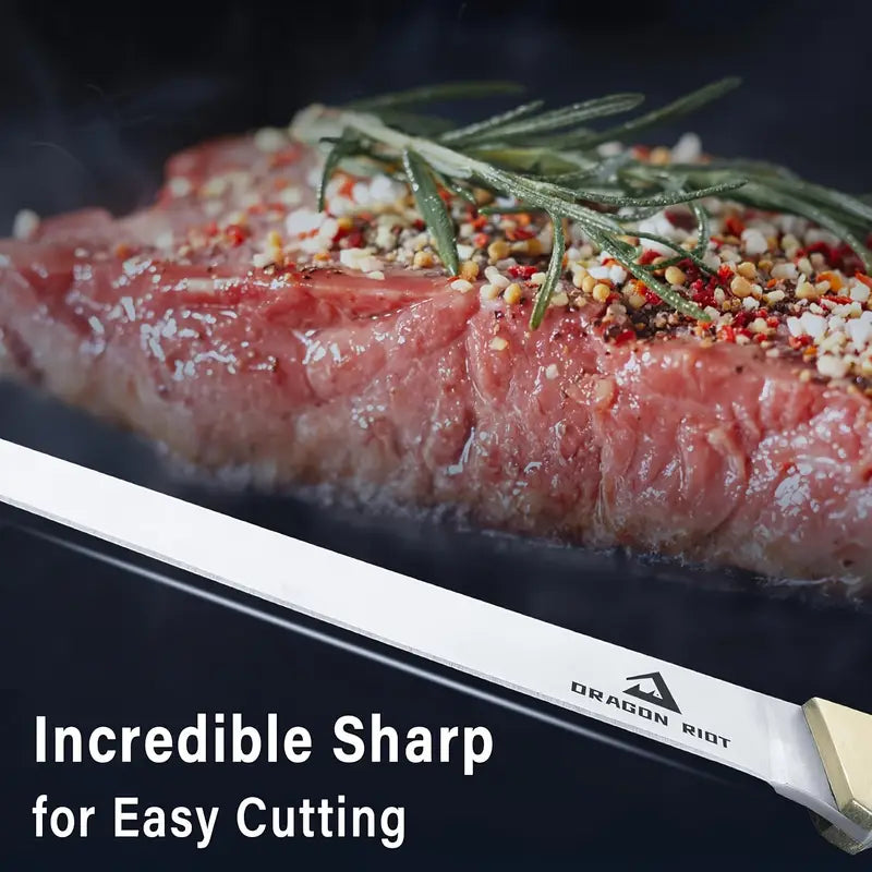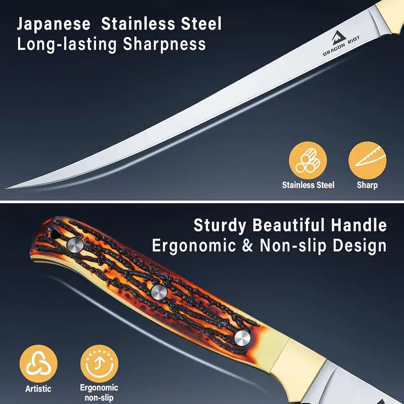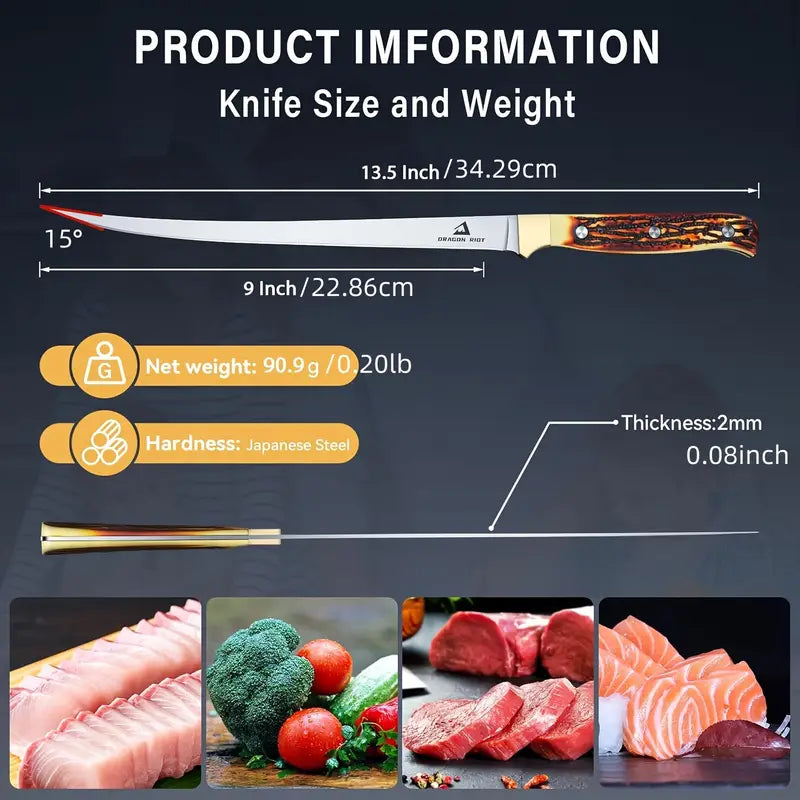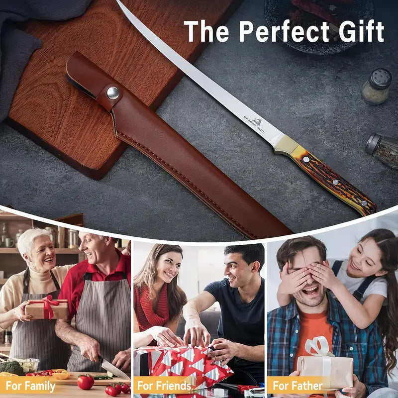 The Huusk 9-inch Professional Fillet Knife is crafted with premium Japanese stainless steel, featuring an ergonomic, non-slip handle for secure and comfortable use. Its precision clip point blade and flat edge make it ideal for filleting meat, poultry, and fish with ease. A perfect gift for Father's Day, Mother's Day, Thanksgiving, or Christmas, this knife combines durability, sharpness, and style for any kitchen enthusiast.