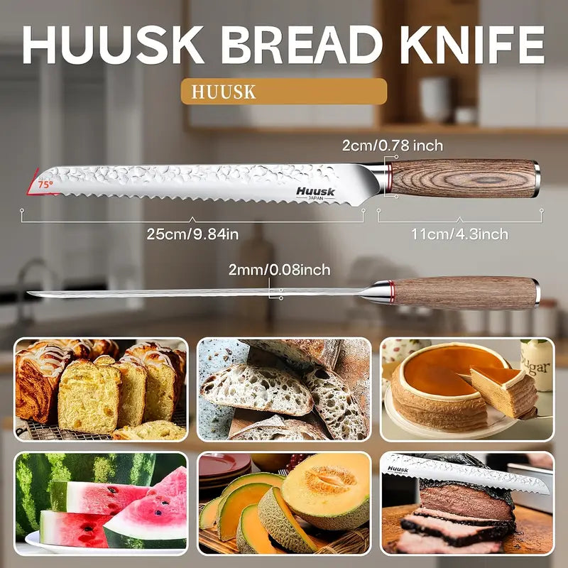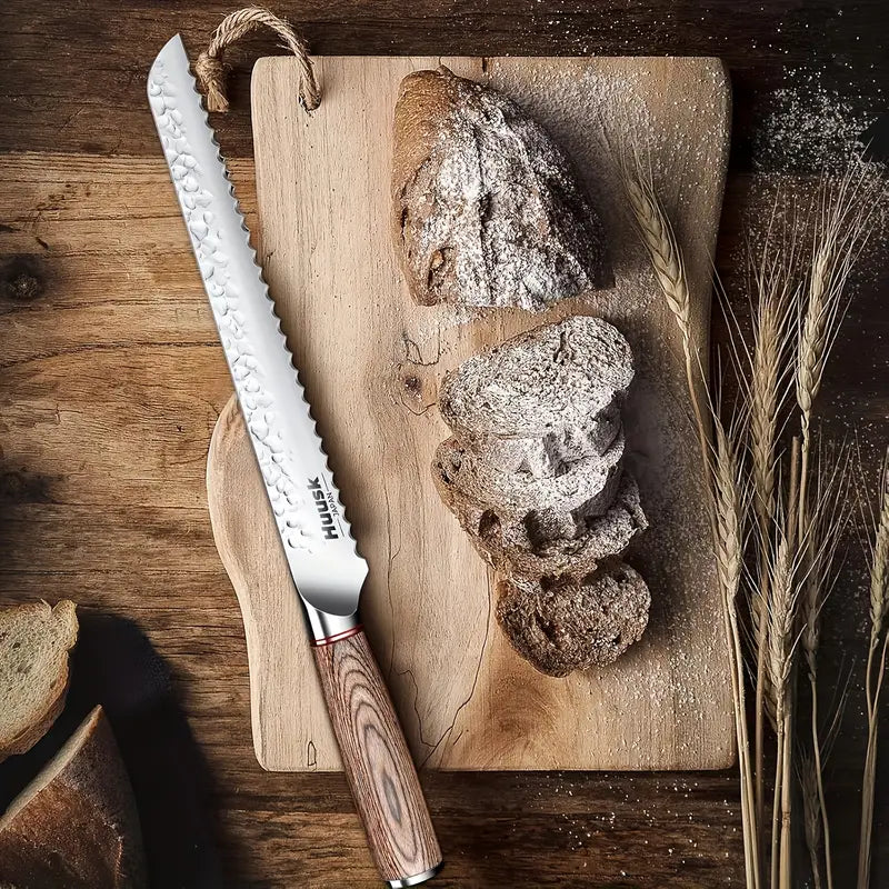 The Huusk Professional 10.26-inch bread knife features an exceptionally sharp Japanese serrated edge, perfect for effortless slicing of bread, cakes, and more. Designed with a heavy-duty Pakka wood-like handle for a comfortable, ergonomic grip, it’s ideal for both home and professional kitchens. With a lifetime warranty, this high-carbon steel knife makes an excellent gift for bakers, chefs, or anyone who loves cooking.