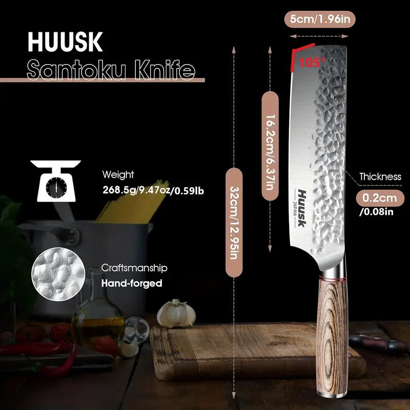 Upgrade your kitchen with the Huusk Professional Japanese Knife Set, featuring a versatile meat cleaver, precise Nakiri, and sharp boning knives. Crafted with high-quality steel and ergonomic Pakkawood handles, these knives offer exceptional balance, comfort, and durability. Perfect for home cooks or professional chefs, this set comes in a stylish gift box, making it an ideal addition to any family kitchen or restaurant.