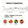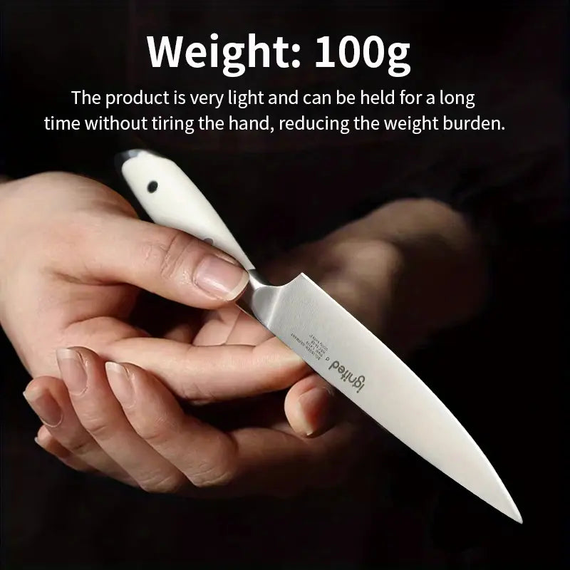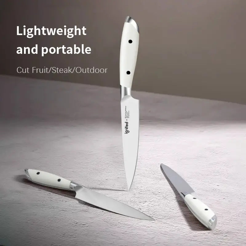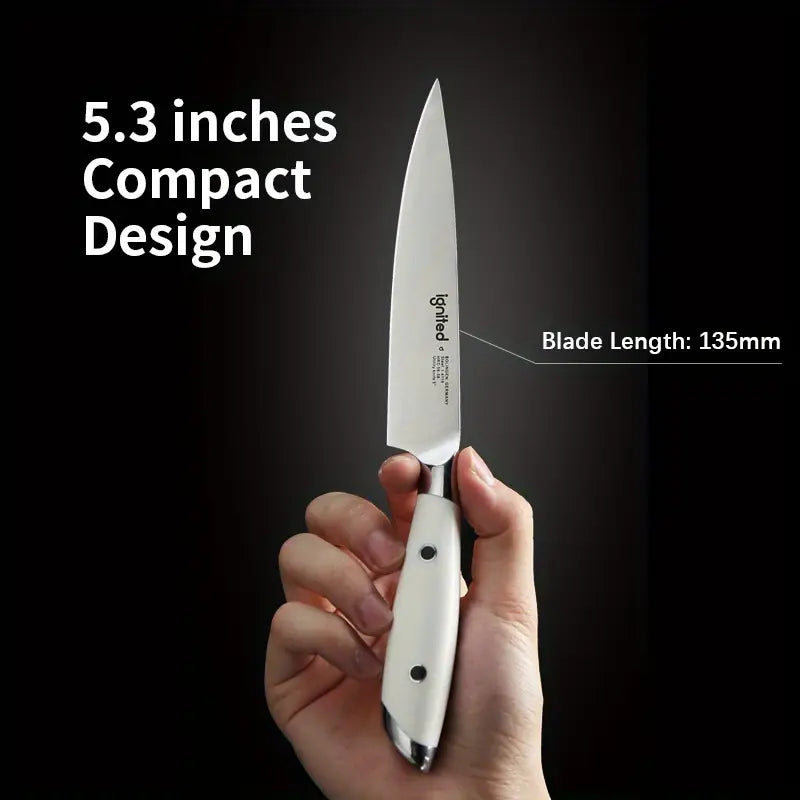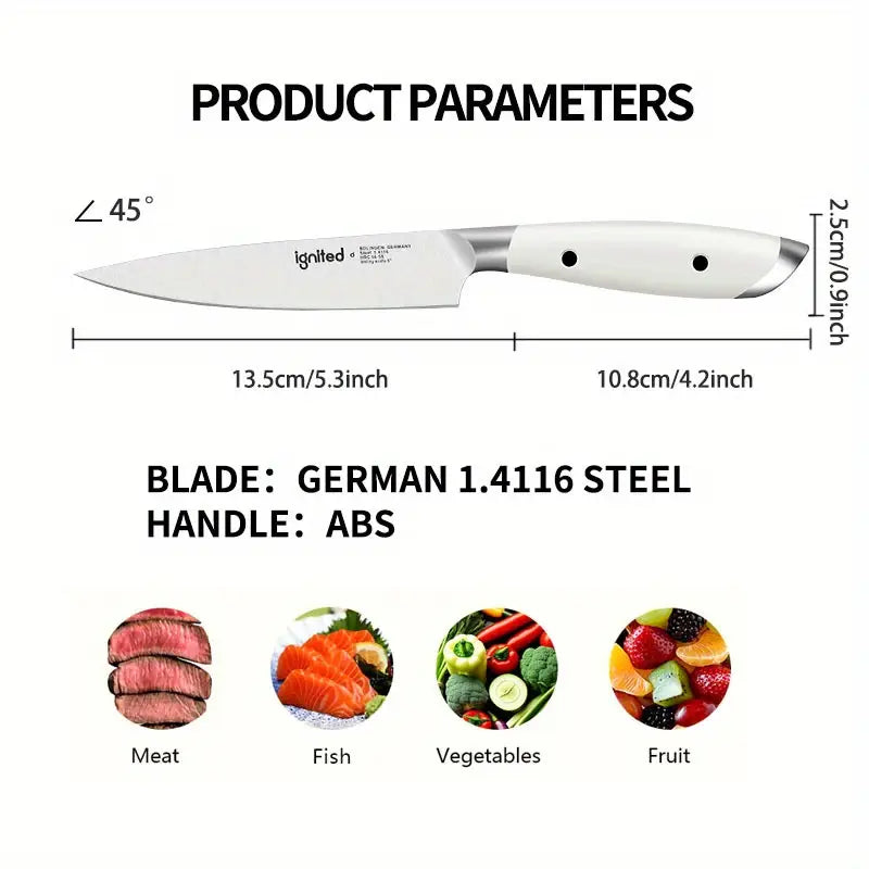 This 1pc IGNITED utility knife features a premium 1.4116 German stainless steel blade, perfect for peeling, slicing, and cutting fruits and vegetables. The ergonomic white ABS handle ensures a comfortable grip, and its lightweight design (100g) makes it easy to handle. Comes in an elegant gift box, making it a perfect present for culinary enthusiasts.
