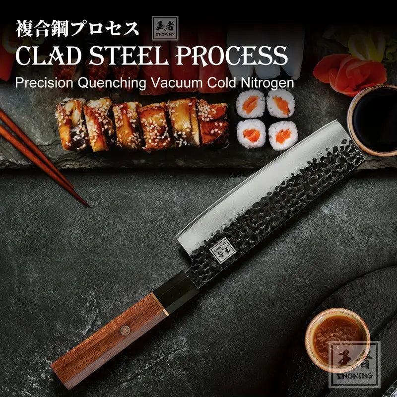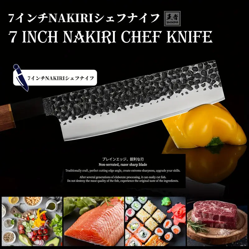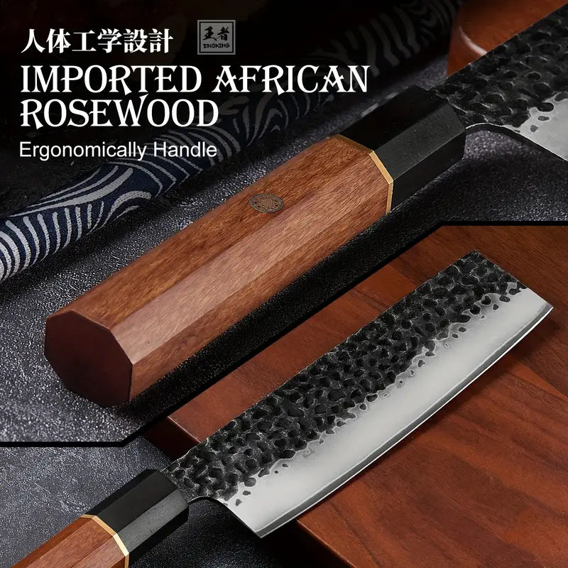 Crafted with precision, this 7-inch Japanese Nakiri Chef Knife is hand-forged from 5-layer 9CR18MOV clad steel for exceptional sharpness and durability. Designed for effortless chopping, slicing, and dicing of vegetables, it features a comfortable rosewood handle for perfect balance and control. Packaged in an elegant wooden gift box, it makes a professional addition to any kitchen and a thoughtful gift for cooking enthusiasts.