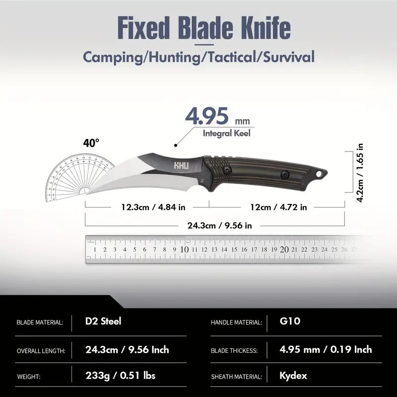 KHU Fixed Blade Hunting Knife – D2 Steel Blade with G10 Handle and Kydex Sheath, Black (22A) for Outdoor, Camping, and Survival