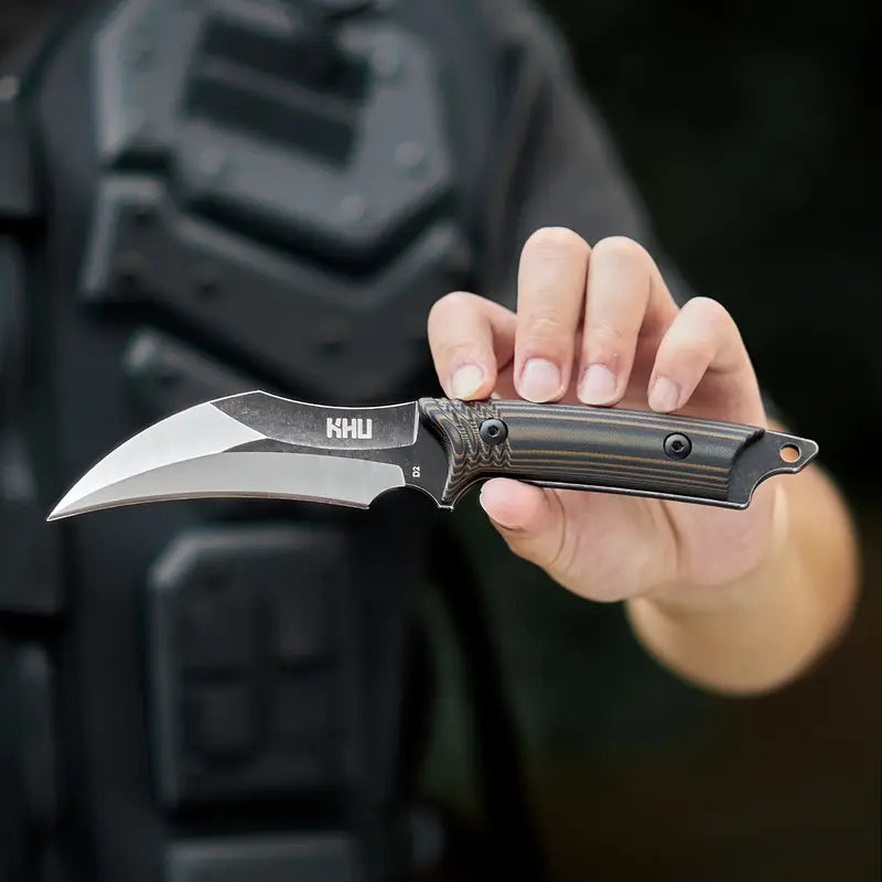 The KHU Fixed Blade Hunting Knife features a durable D2 steel blade for superior edge retention, paired with an ergonomic G10 handle for a secure grip. Its sleek black design, along with a Kydex sheath for safe storage and easy carry, makes it an ideal companion for outdoor adventures, hunting, and survival tasks.