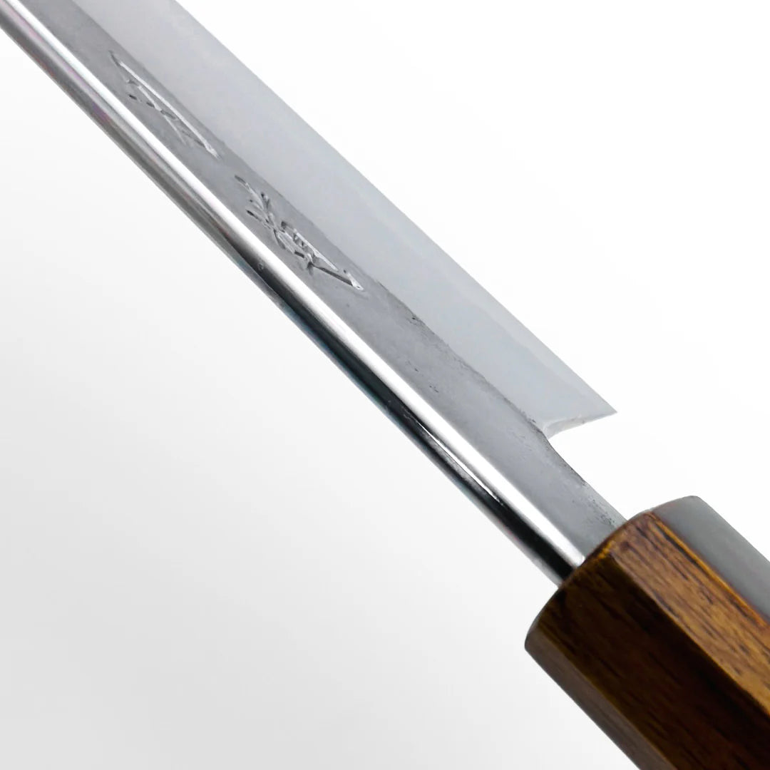 The Kirisame White #1 Gyuto 210mm (8.2") knife features a high-performance White #1 steel blade, known for its excellent sharpness and edge retention, making it perfect for all your culinary tasks. Its 210mm length offers versatility for both precision cuts and larger tasks. The beautifully crafted Urushi oak handle ensures a secure, comfortable grip, combining both style and functionality for professional chefs and home cooks alike.