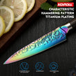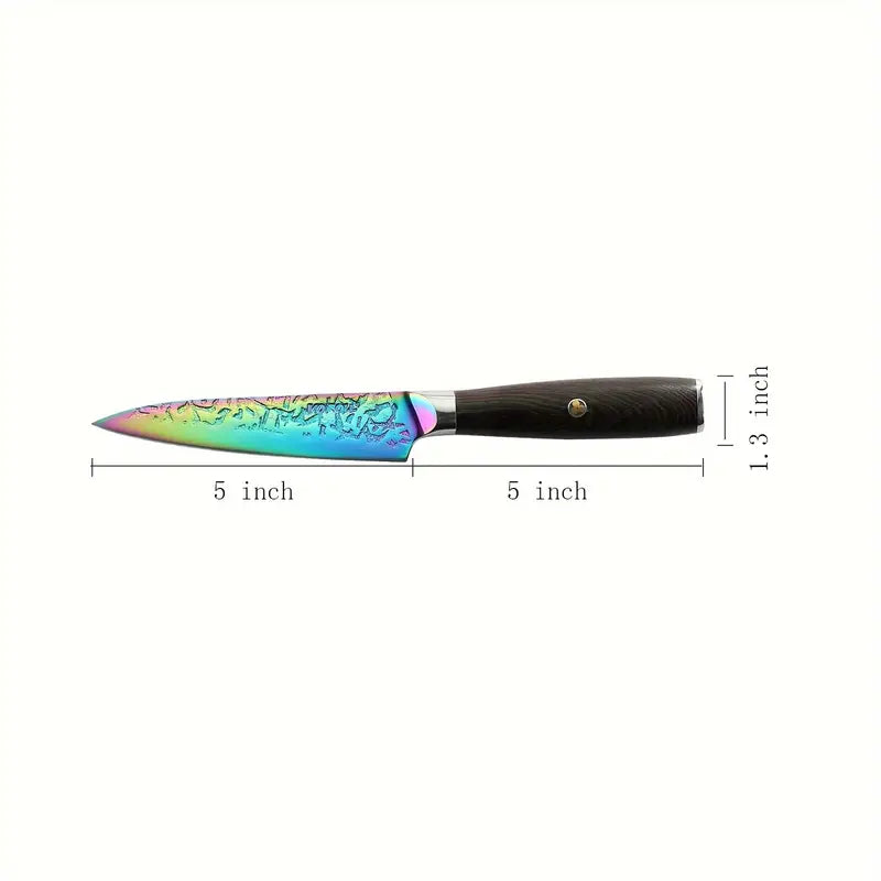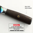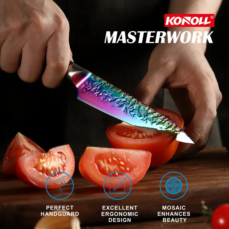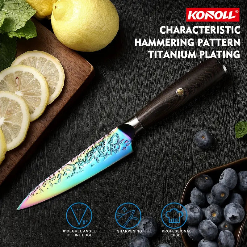 The KONOLL 5-inch utility knife features a titanium coating and a 5Cr15Mov German high carbon stainless steel blade, offering razor-sharp precision for cutting, peeling, and paring fruits and vegetables. The solid wood full tang handle ensures durability and a comfortable grip, making it the ideal professional kitchen knife for both home cooks and chefs.