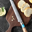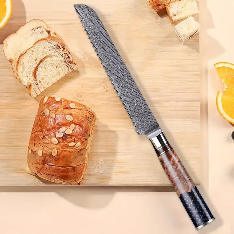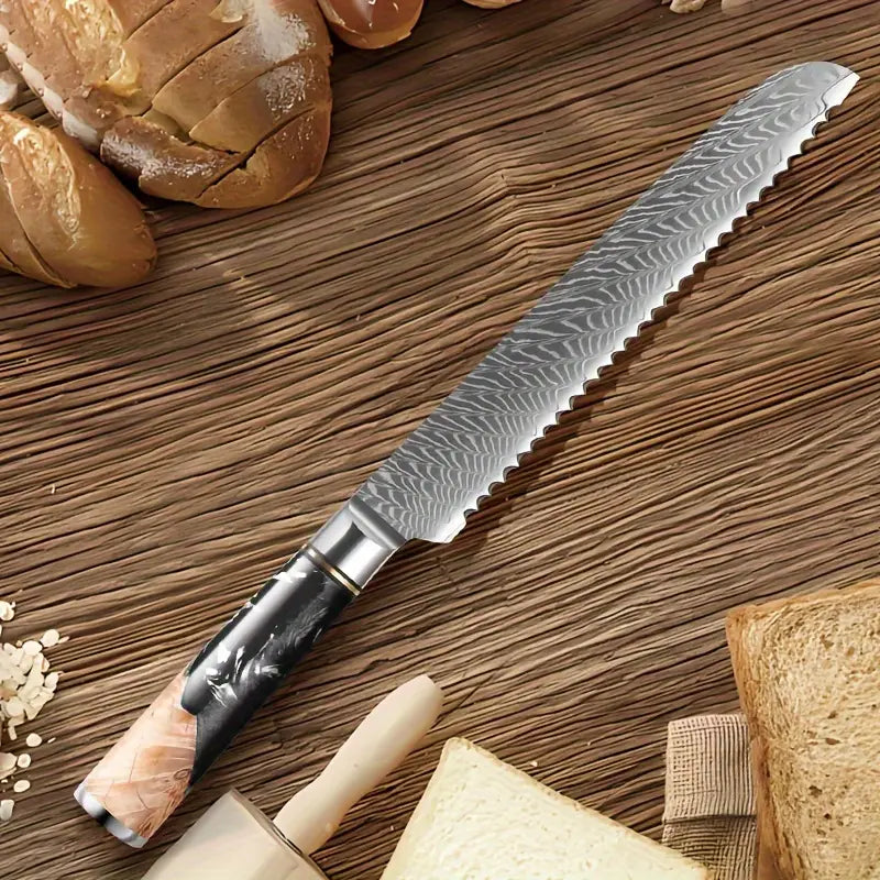Multifunctional Serrated Bread Knife – Damascus Stainless Steel with Wavy Edges & Wood/Resin Handle