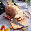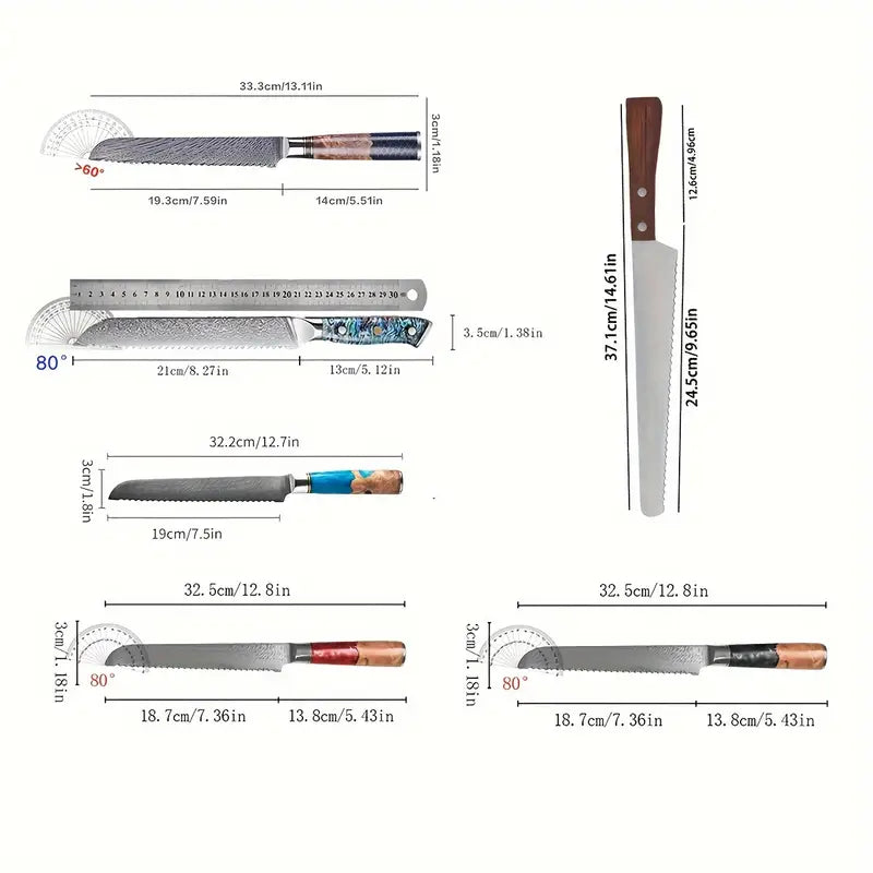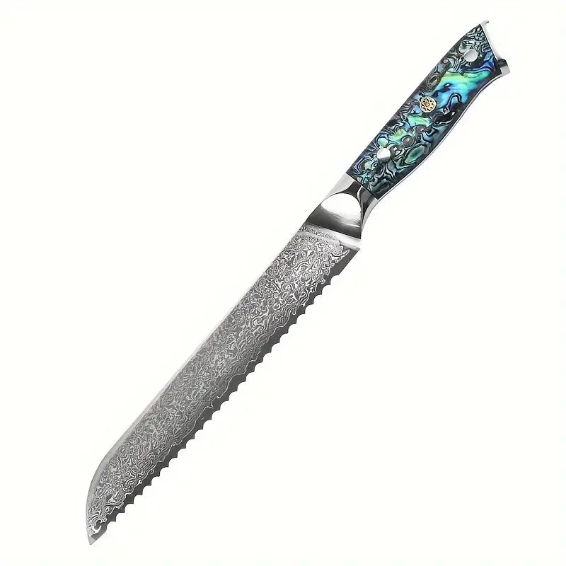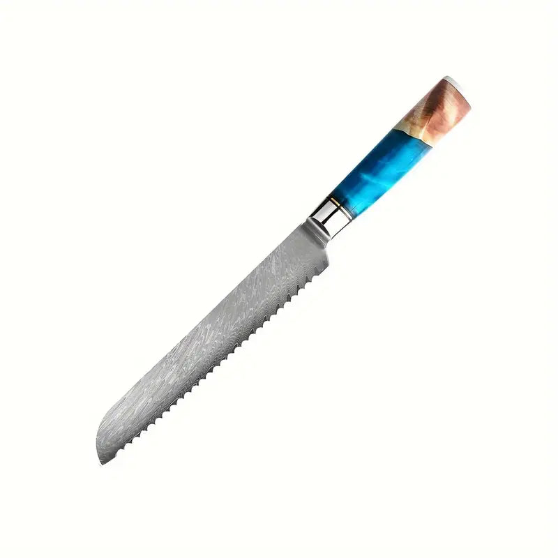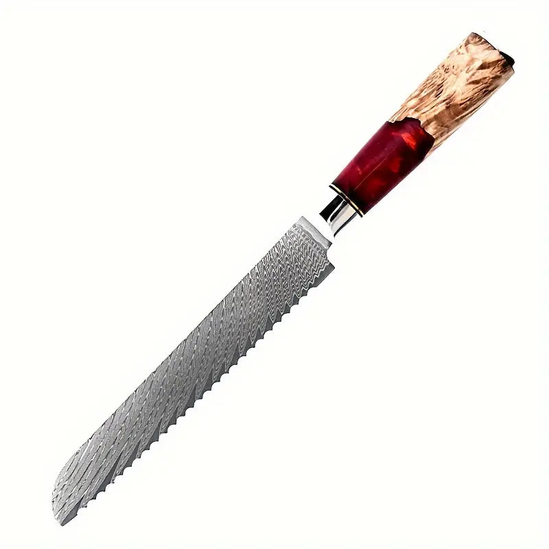 This multifunctional serrated knife features a sharp Damascus stainless steel blade with innovative wavy edges, ideal for cutting homemade bread, bagels, and sourdough. The wood/resin handle ensures a comfortable grip, making it a perfect kitchen tool for family use or as a thoughtful gift for Father’s Day.