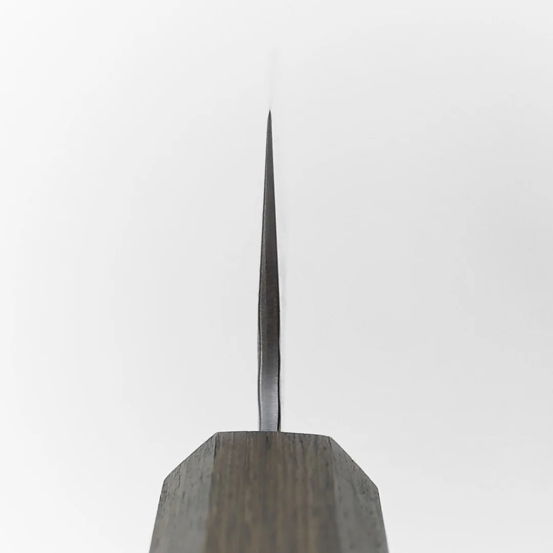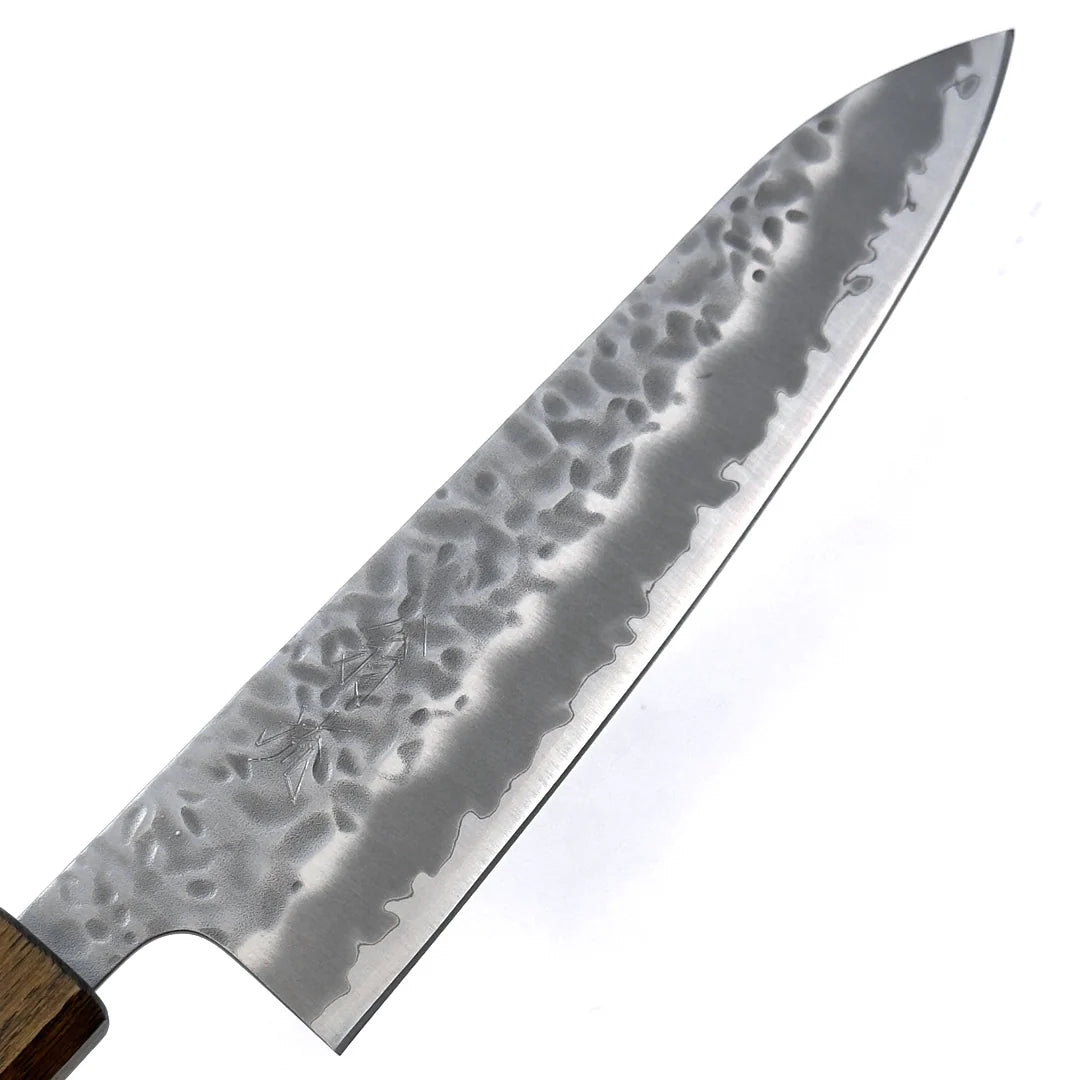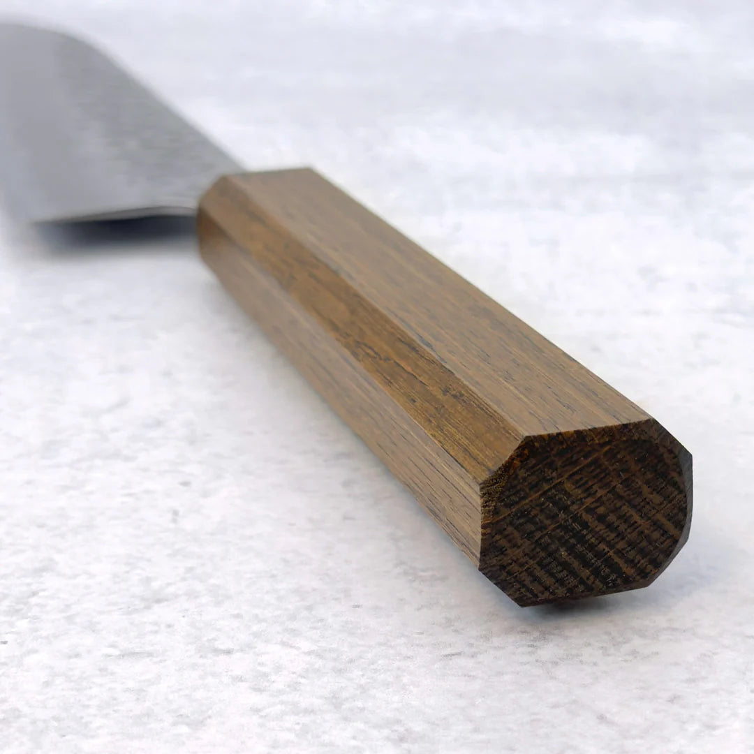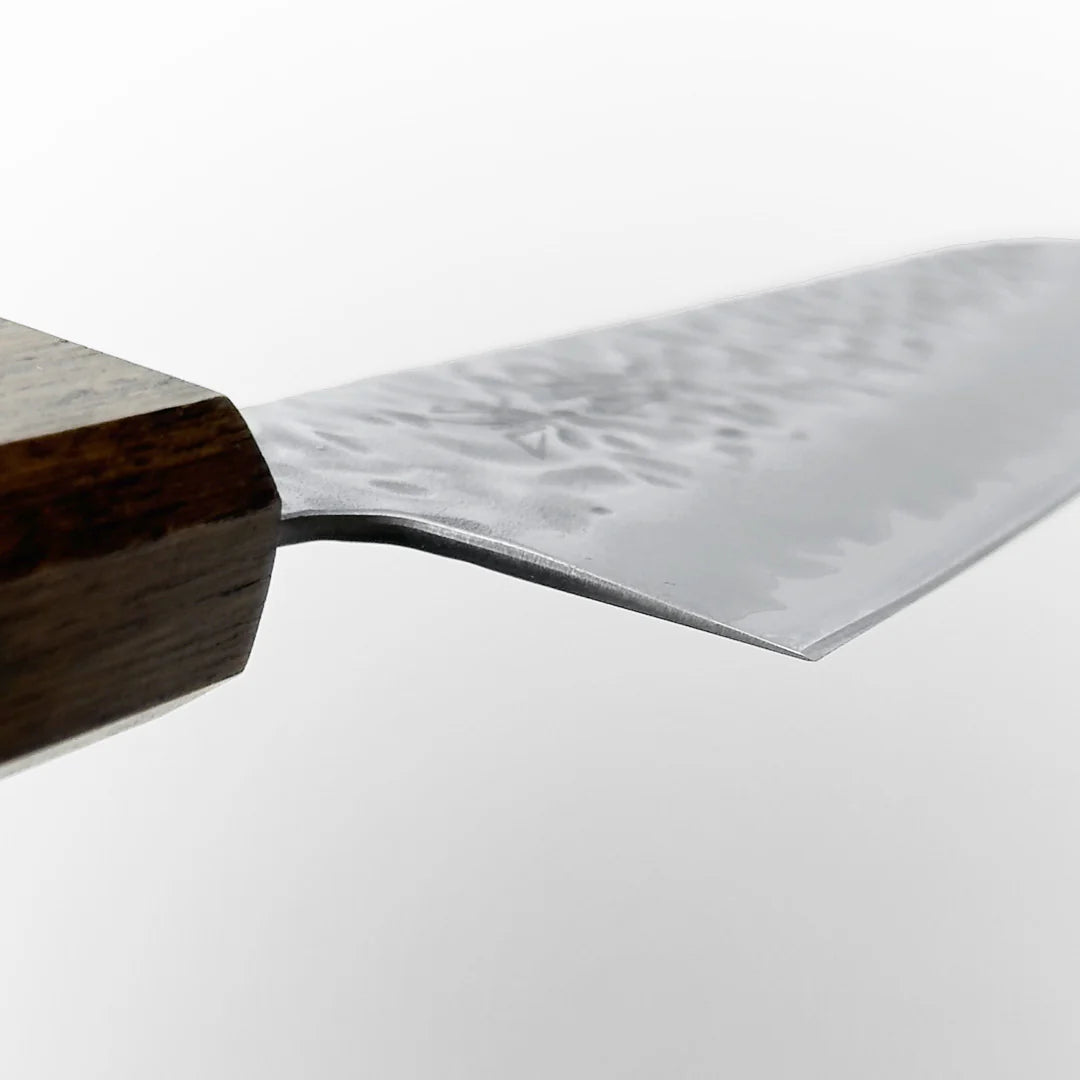 Experience precision and craftsmanship with the OUL White 210mm (8.2") Hammered Tsuchime Chef Knife. Its beautifully hammered blade not only reduces food sticking but also adds a striking aesthetic to your kitchen. Perfectly balanced and sharp, this knife is ideal for slicing, dicing, and chopping with ease, making it a must-have for both professional chefs and home cooking enthusiasts.