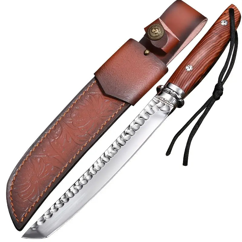 This outdoor camping straight knife features a durable fixed blade designed for wilderness exploration, mountaineering, fishing, and hiking. Its sturdy construction ensures reliable performance for cutting and survival tasks, making it an essential tool for outdoor enthusiasts seeking a versatile and dependable companion.