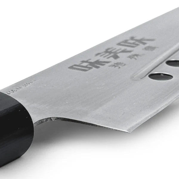 Experience precision and ease in the kitchen with this 205mm (8.1") Perforated Gyuto knife. Designed for professional chefs and home cooks alike, its sharp, durable blade effortlessly slices, chops, and dices, while the perforations reduce sticking and improve food release, making every cut smoother and more efficient. Perfect for vegetables, meats, and all-around kitchen prep.
