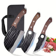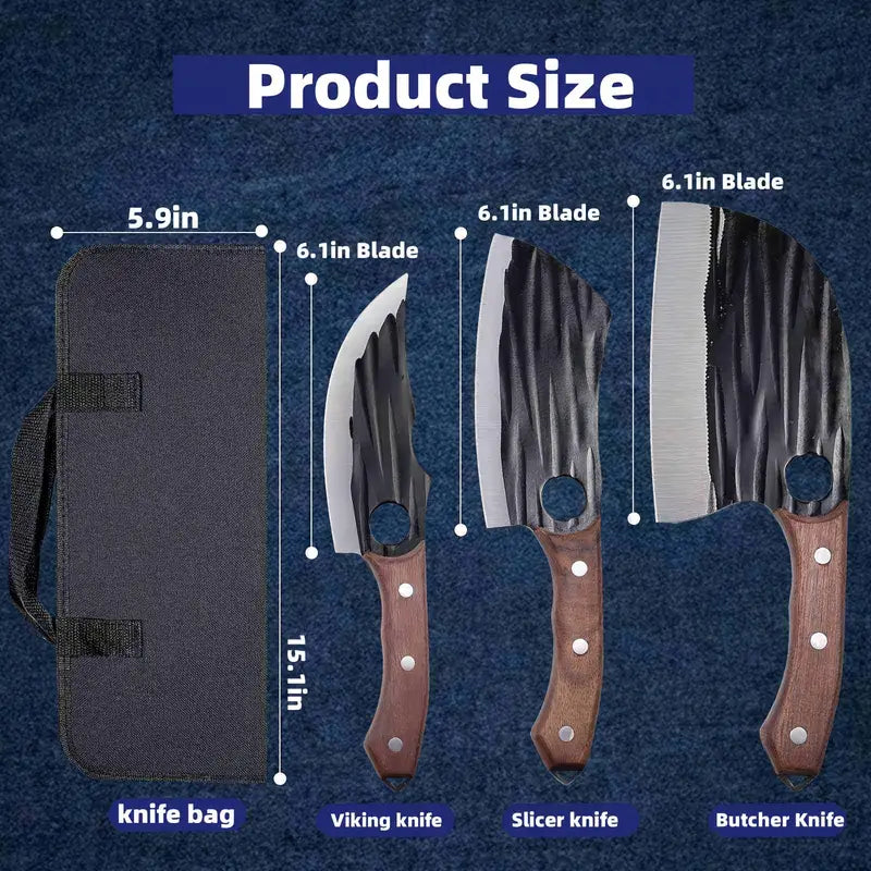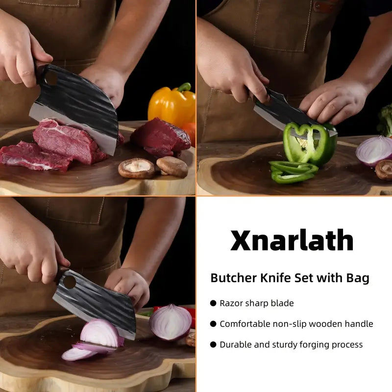 Upgrade your kitchen or outdoor cooking experience with this premium butcher knife set. Crafted from high carbon steel and hand-forged for durability, the set includes a meat cleaver, boning and carving knives, and a versatile vegetable knife. Perfect for meat processing, BBQs, camping, or home use, each knife delivers precision cutting and long-lasting sharpness, all conveniently stored in a sturdy carrying bag for easy transport and safe storage.