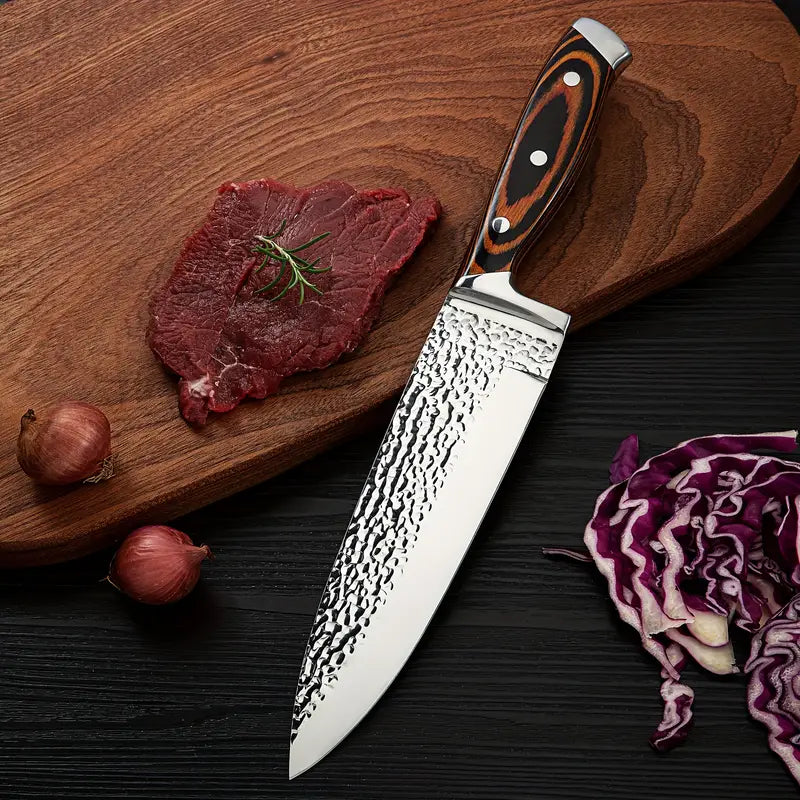 Upgrade your kitchen with this professional 14 or 16-piece knife set, crafted from medium carbon stainless steel for exceptional sharpness and durability. The set includes chef knives, steak knives, and essential kitchen tools, all housed in a stylish hammered wooden block. Complete with a sharpener, it’s perfect for home chefs and makes a thoughtful gift for family and friends.