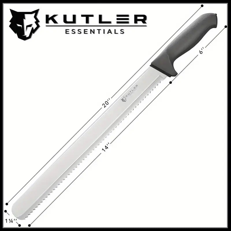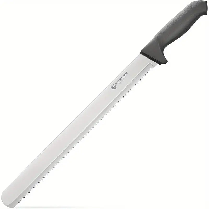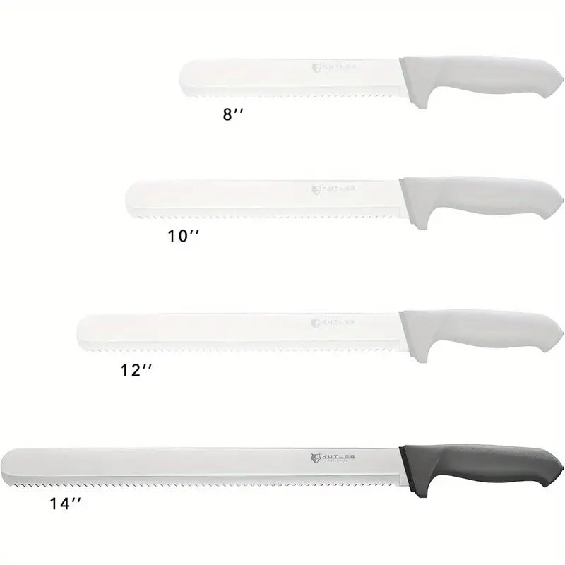 This 14-inch professional bread knife and cake slicer features a serrated edge made from ultra-sharp stainless steel, ensuring effortless slicing of bread, cakes, and other baked goods. Its durable construction and ergonomic design offer precision, making it a must-have tool for every kitchen. Whether you're slicing through crusty loaves or delicate cakes, this knife provides smooth, clean cuts every time.