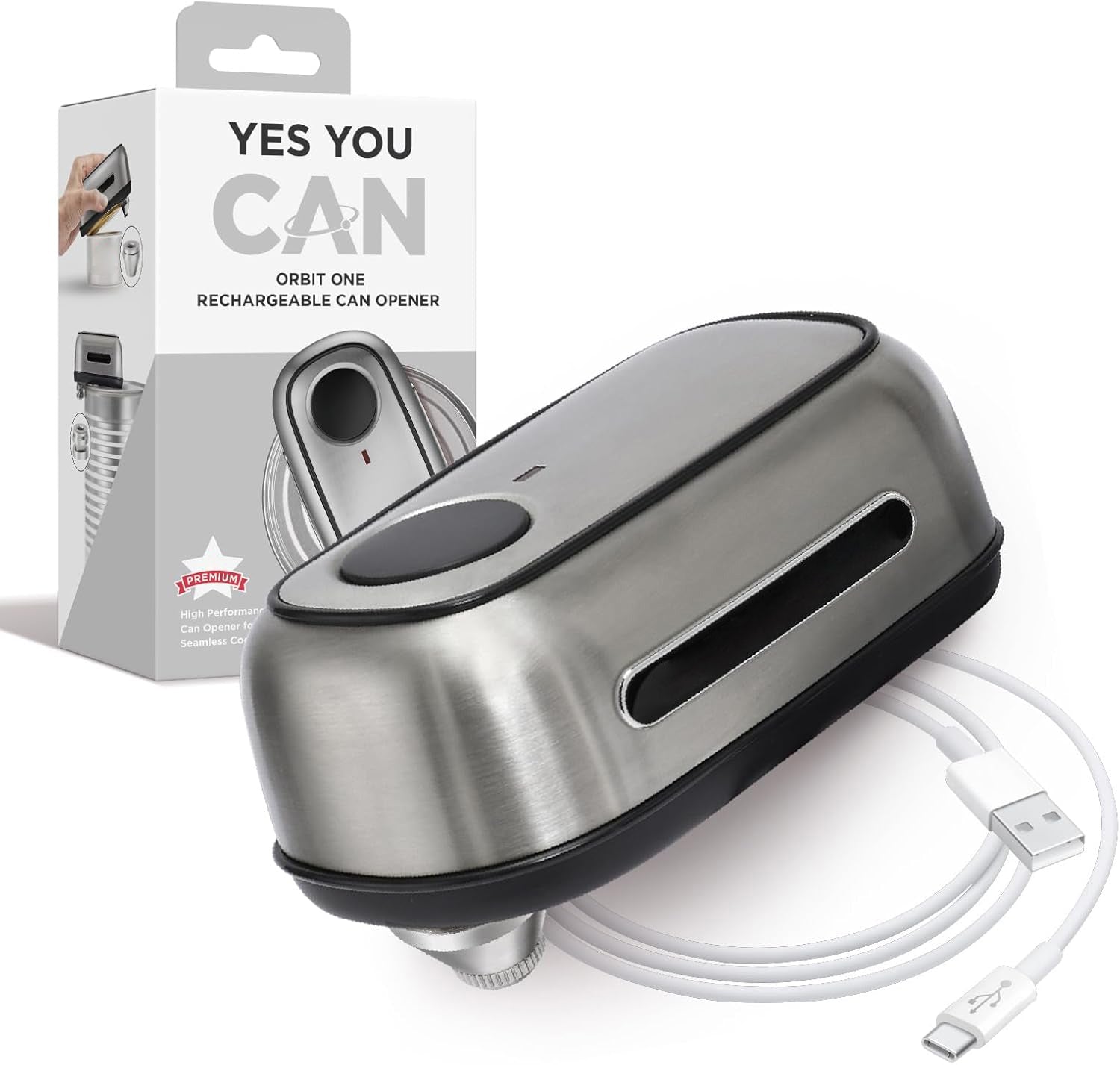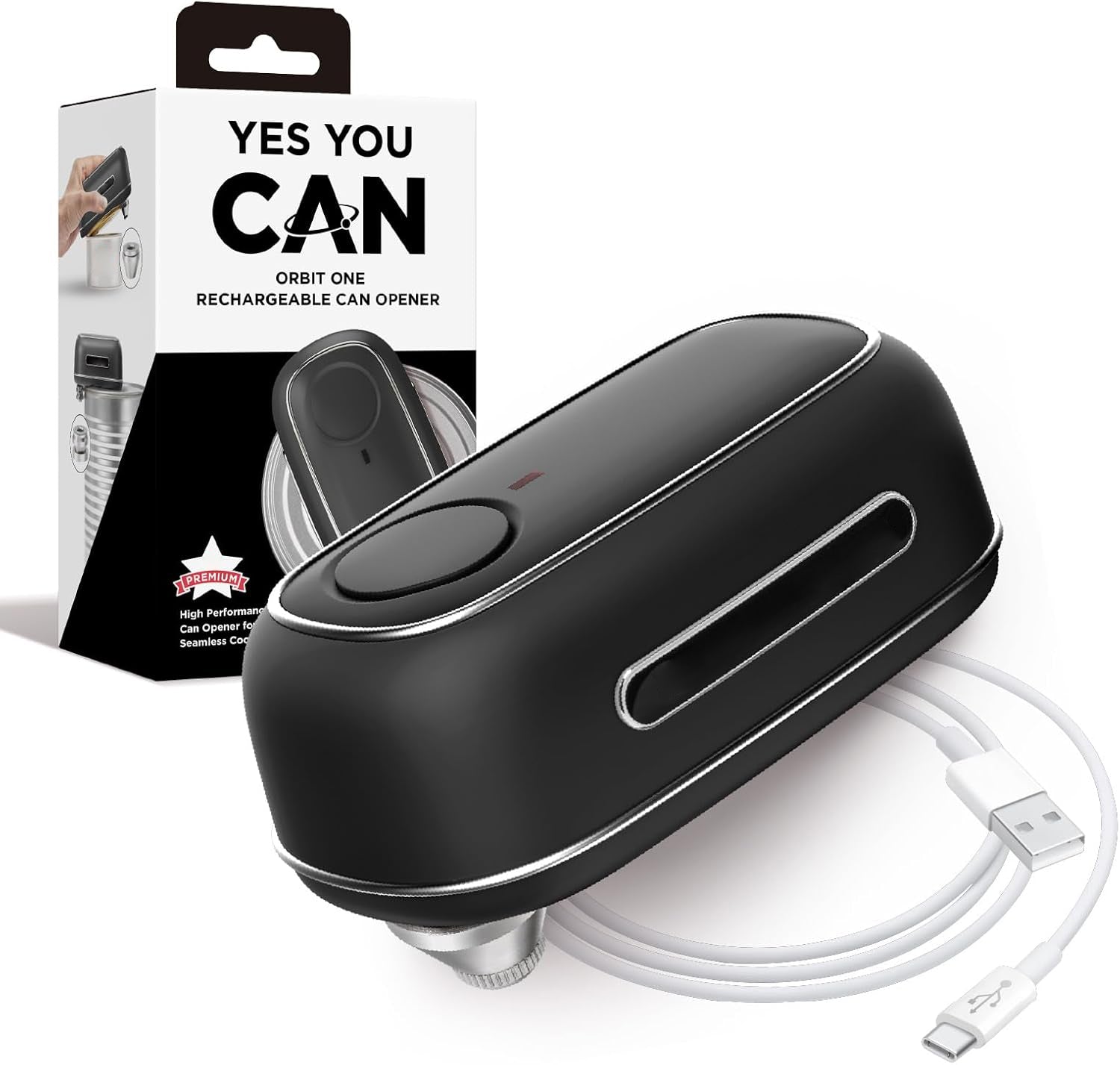 - The Kitchen Mama Orbit One Rechargeable Electric Can Opener brings convenience and safety to your kitchen with hands-free automatic operation and USB-C fast charging. Designed for ease and precision, it effortlessly opens cans of all sizes with a smooth-edge stainless steel blade that prevents sharp edges and injuries.