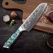 Elevate your kitchen experience with this Santoku 7" Chef Knife, crafted with a 67-layer Damascus steel blade for unmatched sharpness and durability. The luxurious Abalone Shell and Resin handle offers a comfortable grip while adding elegance to your kitchen. Packaged in a beautiful gift box, this knife is perfect for gifting or enhancing your culinary tools collection.