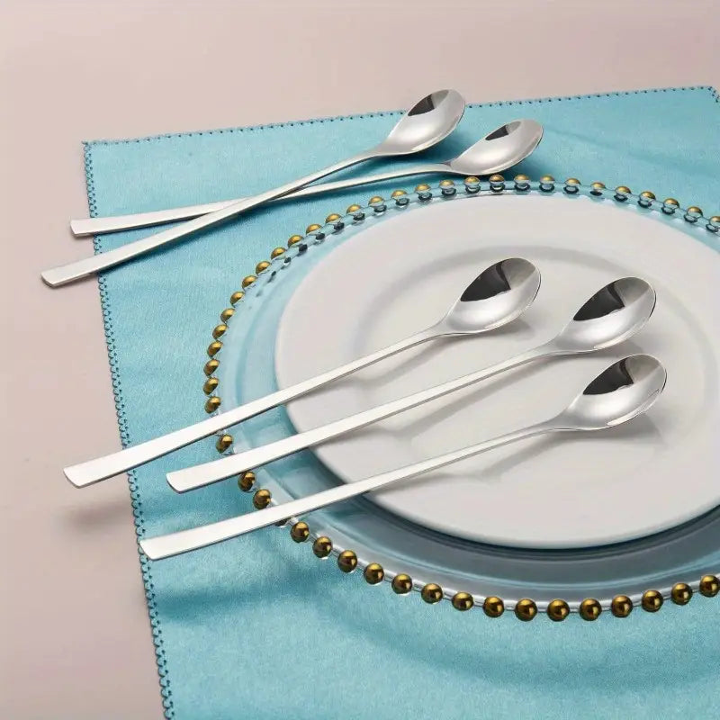Elevate your dining and bar experience with this Set of 6 Long Handle Stainless Steel Spoons. Crafted from durable 18/10 stainless steel, these sleek 9-inch teaspoons are perfect for stirring tall glasses of iced tea, mixing cocktails, or enjoying ice cream and desserts.