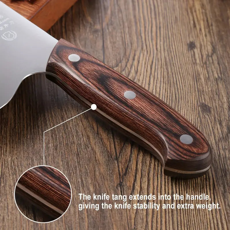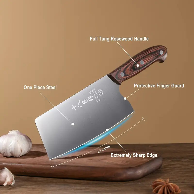 This SHI BA ZI ZUO 6.7-inch vegetable cleaver is crafted with durable 40CR stainless steel for precision cutting and longevity. Its ergonomic wooden handle ensures a comfortable grip, making it perfect for chopping, slicing, and dicing vegetables. A must-have tool for both home cooks and professional chefs.
