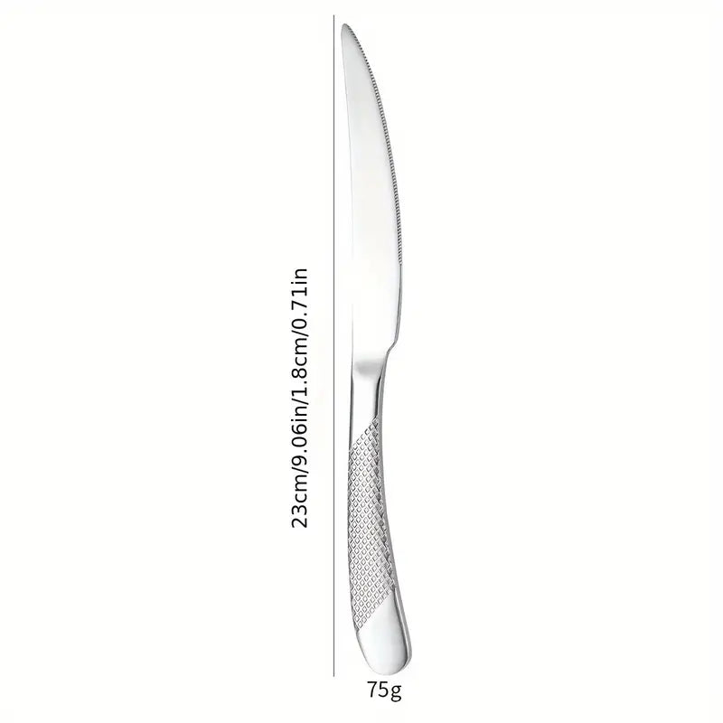 Experience precision and elegance with this high-quality Western steak knife. Featuring a super sharp serrated edge and thickened design, it ensures effortless cutting of meat, bread, and vegetables. Perfect for family gatherings, new home tableware sets, or high-end restaurant kitchens. Stylish, durable, and dishwasher safe, this knife combines functionality with sophistication for everyday use or special occasions.