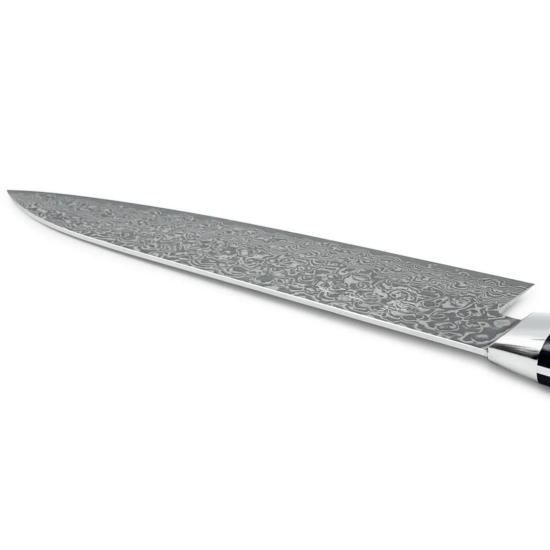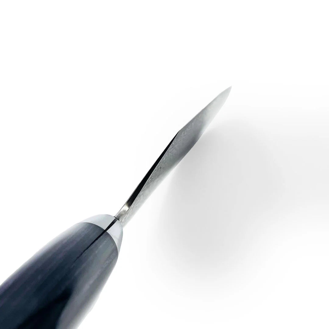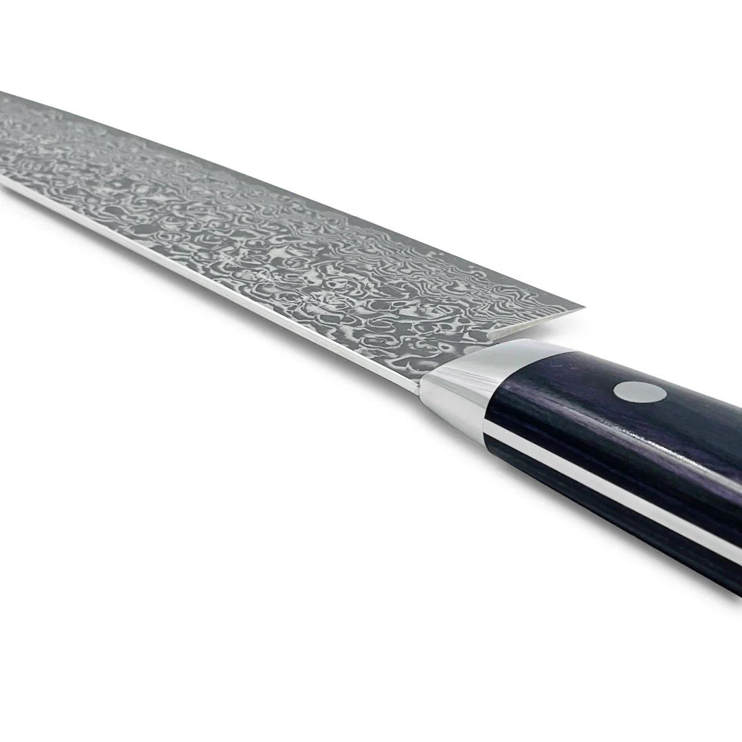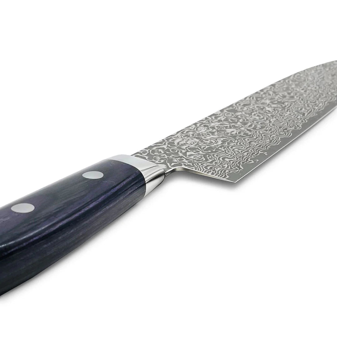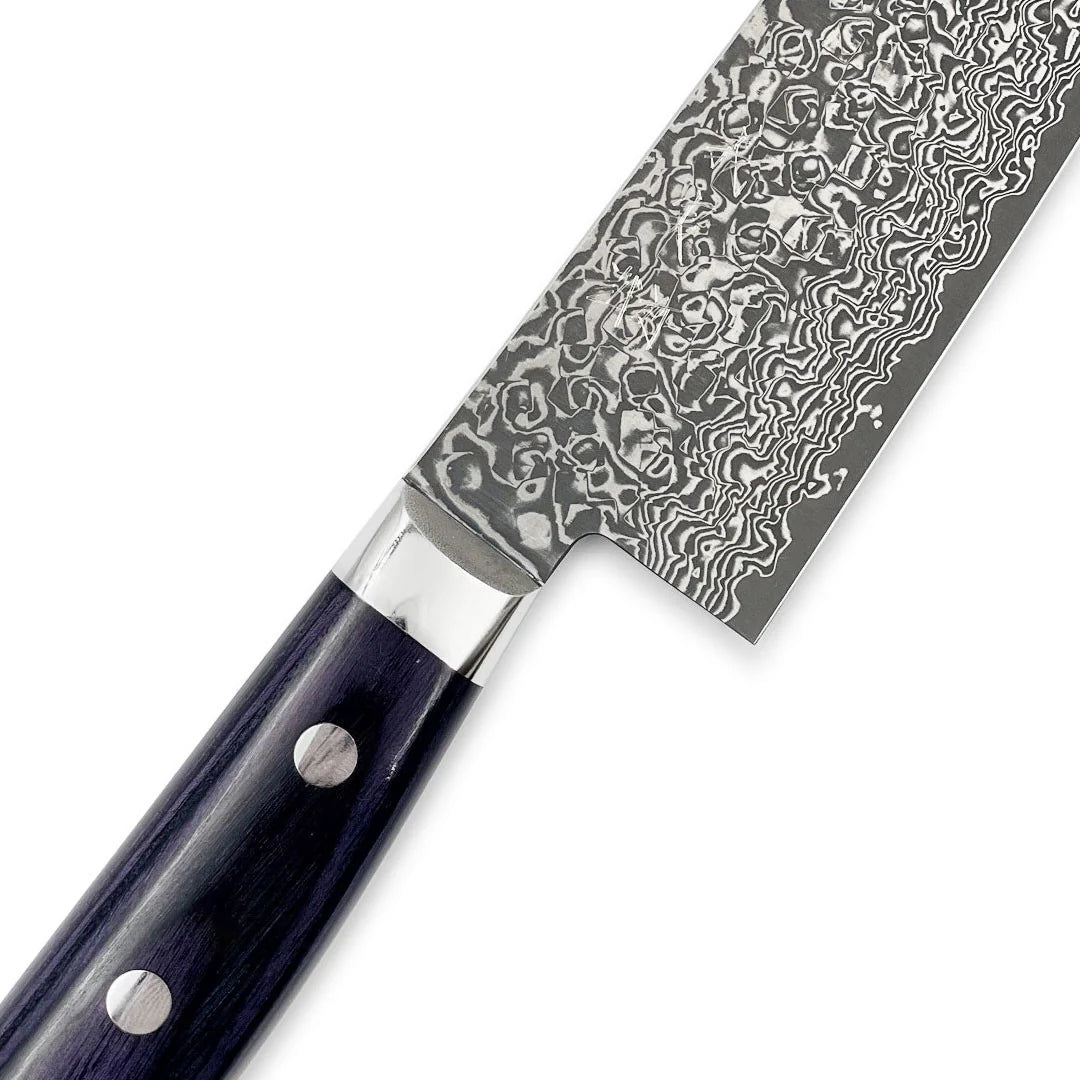 This VG-10 Nickel Damascus Gyuto knife, with a 180mm (7.1") blade, offers a perfect balance of precision and durability. Its beautiful dark purple handle adds a touch of elegance, while the high-quality VG-10 core ensures excellent sharpness and edge retention. Ideal for both professional chefs and home cooks, this knife is designed for effortless slicing, dicing, and chopping, making it an essential tool for any kitchen.