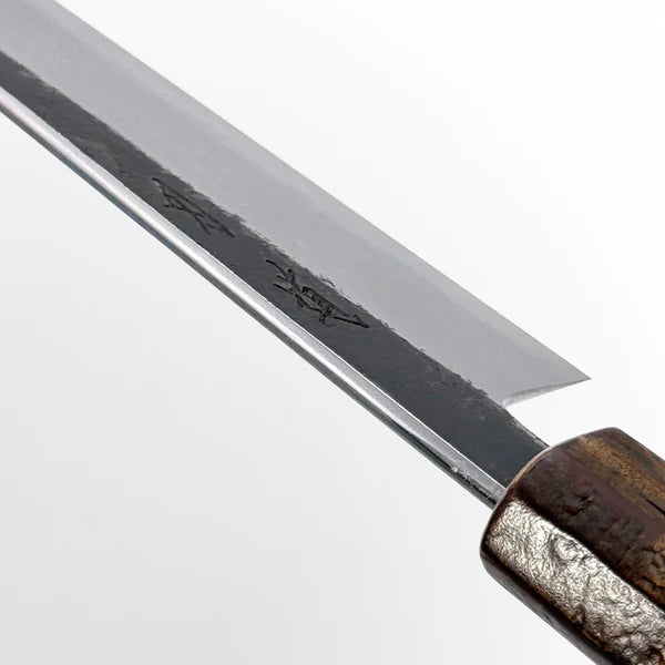 The White #2 Kiritsuke Gyuto 210mm (8.2") Knife features a sharp, durable blade crafted from premium White #2 steel, ideal for precise cuts and versatile in the kitchen. The elegant black oak handle offers a comfortable, ergonomic grip, making it the perfect choice for professional chefs and home cooks alike.