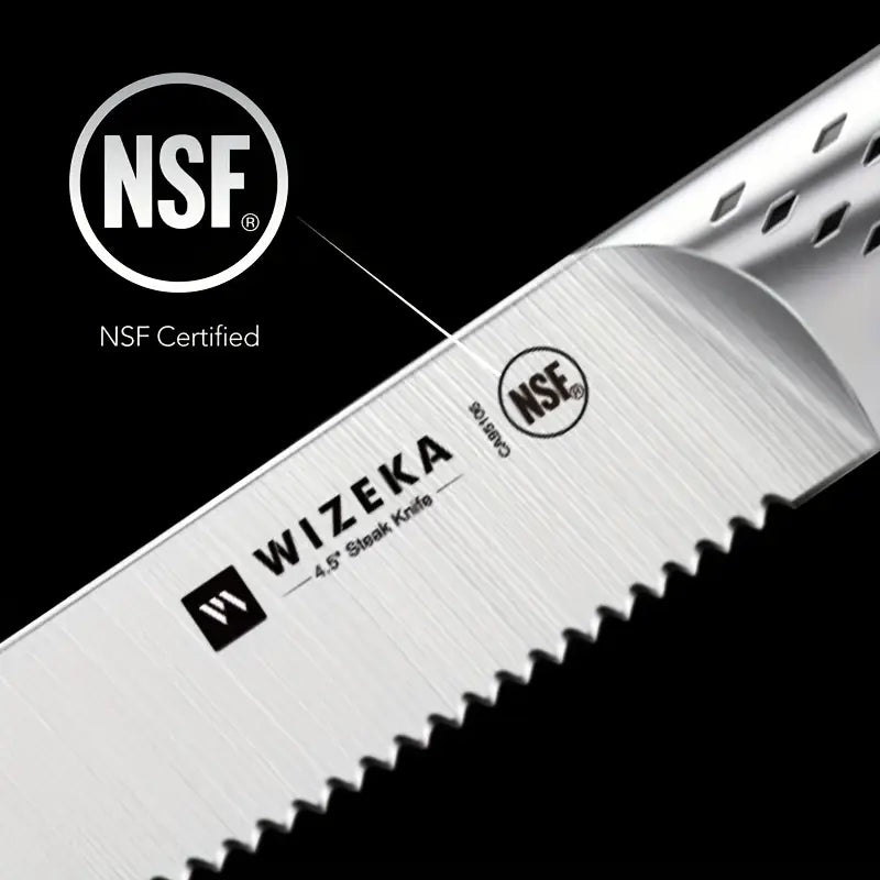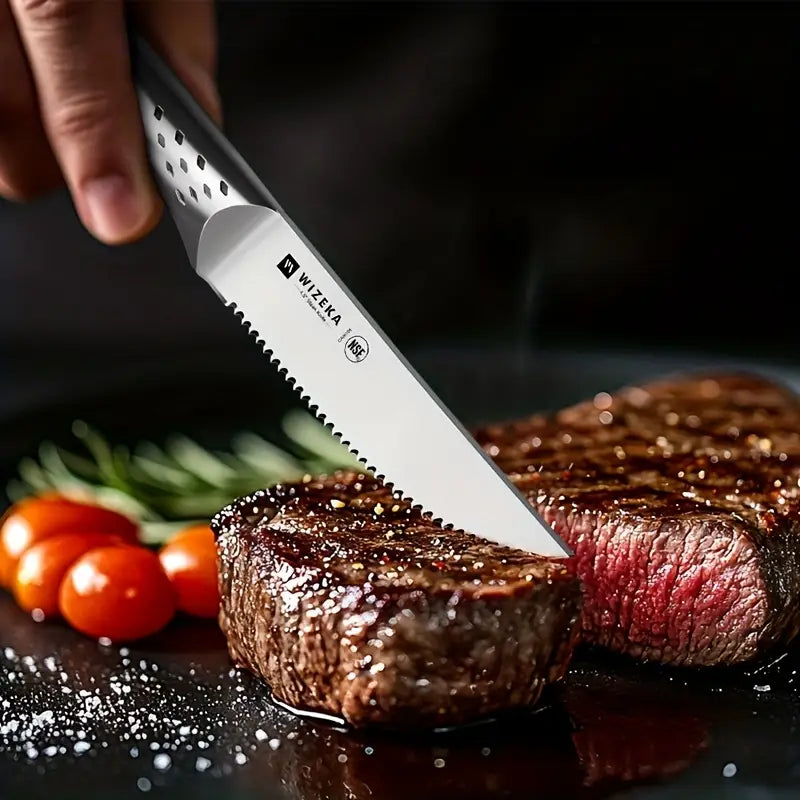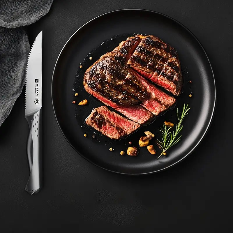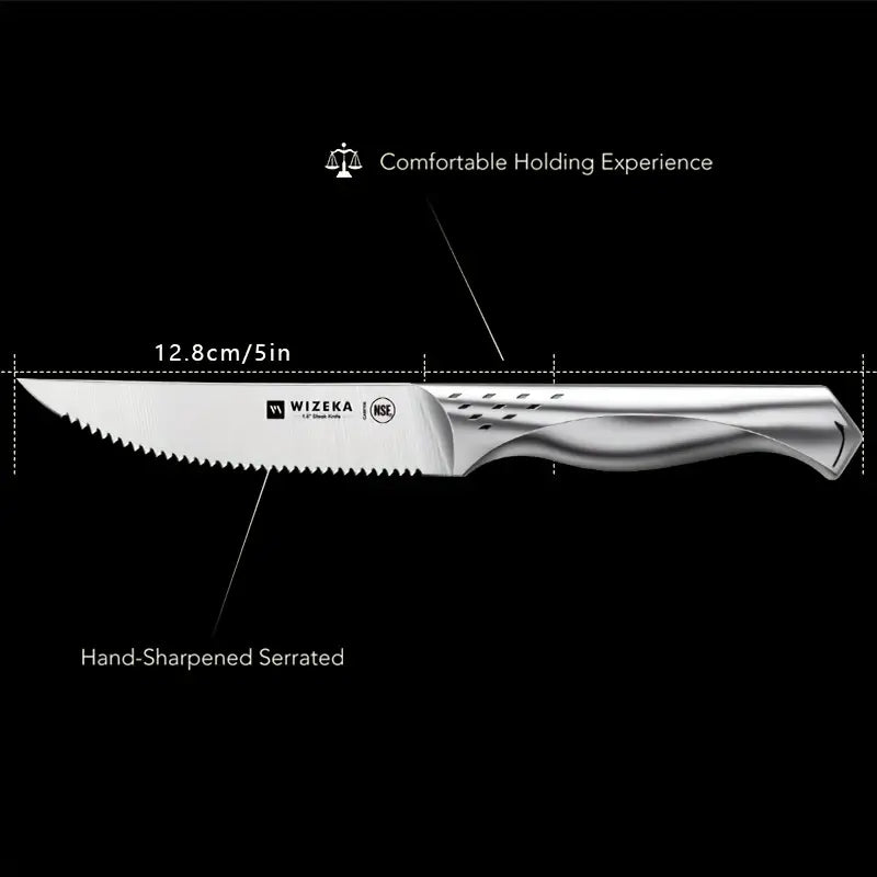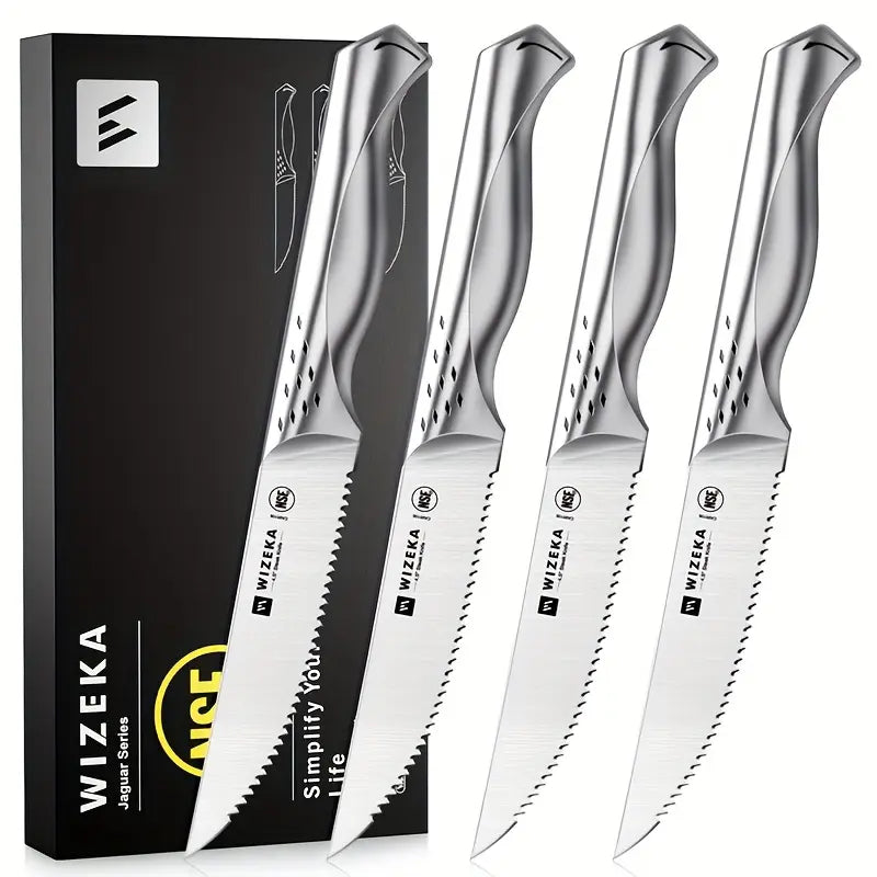 Upgrade your dining experience with WIZEKA Jaguar Series steak knives. Available in 4, 6, or 8-piece sets, each 4.5-inch knife features premium German stainless steel and serrated edges for effortless steak cutting. Dishwasher safe and durable, perfect for home, restaurant, or special occasions.